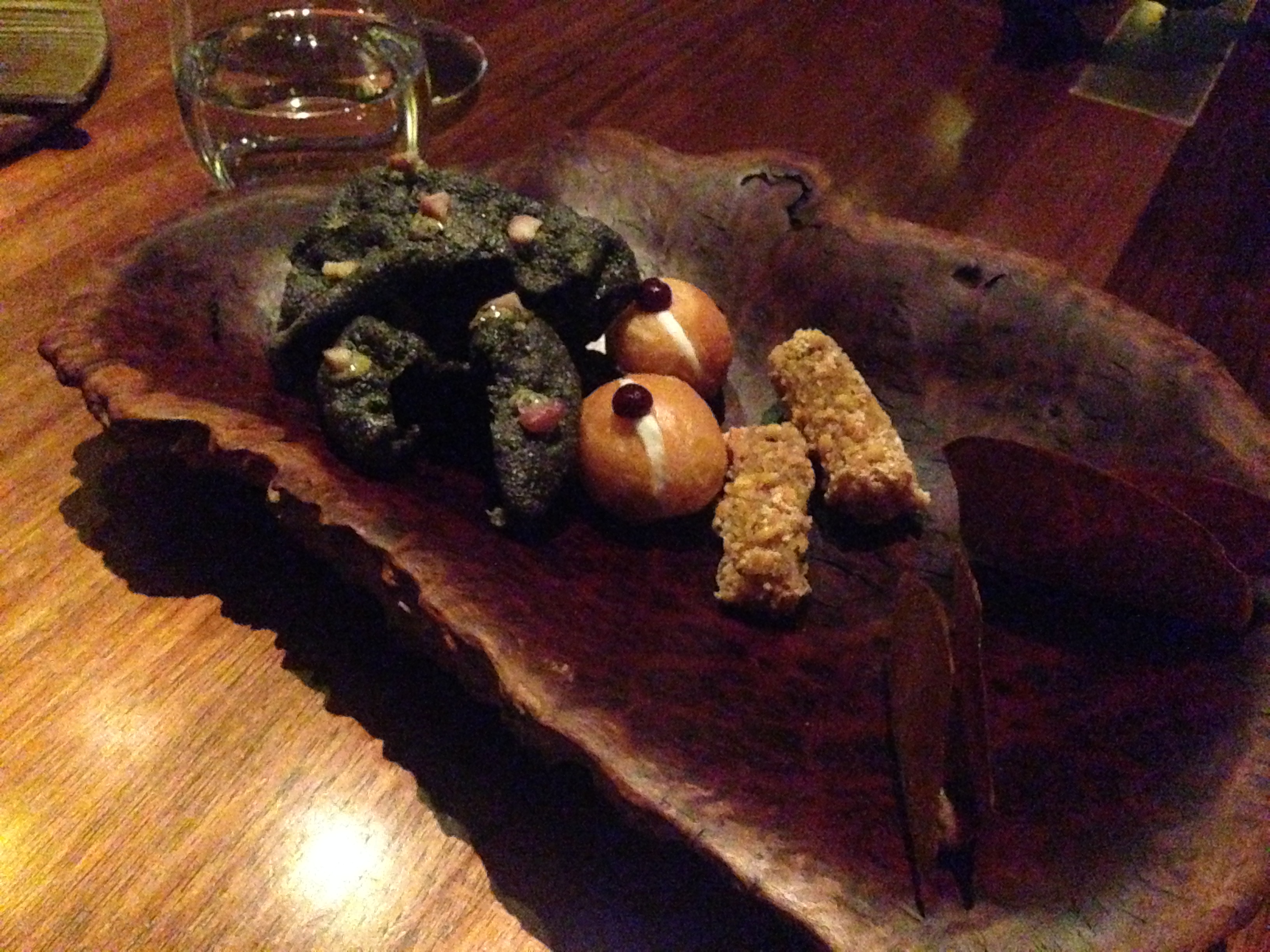 Drapped Mayura wagyu is chopped into finely formed bite sized pieces with pinenuts, macadamias and chicory that when combined together have a great impact. Not to be overshadowed, the second oldest wine we tried for the night was the 1995 Old Vine Shiraz Mourvedre Grenache which is a Southern Rhone style that is full of fruit, but naturally soft through the aging process. At this stage Catherine gets the opportunity to try a 1987 St Henri which I sneak a sip of and it is even better.