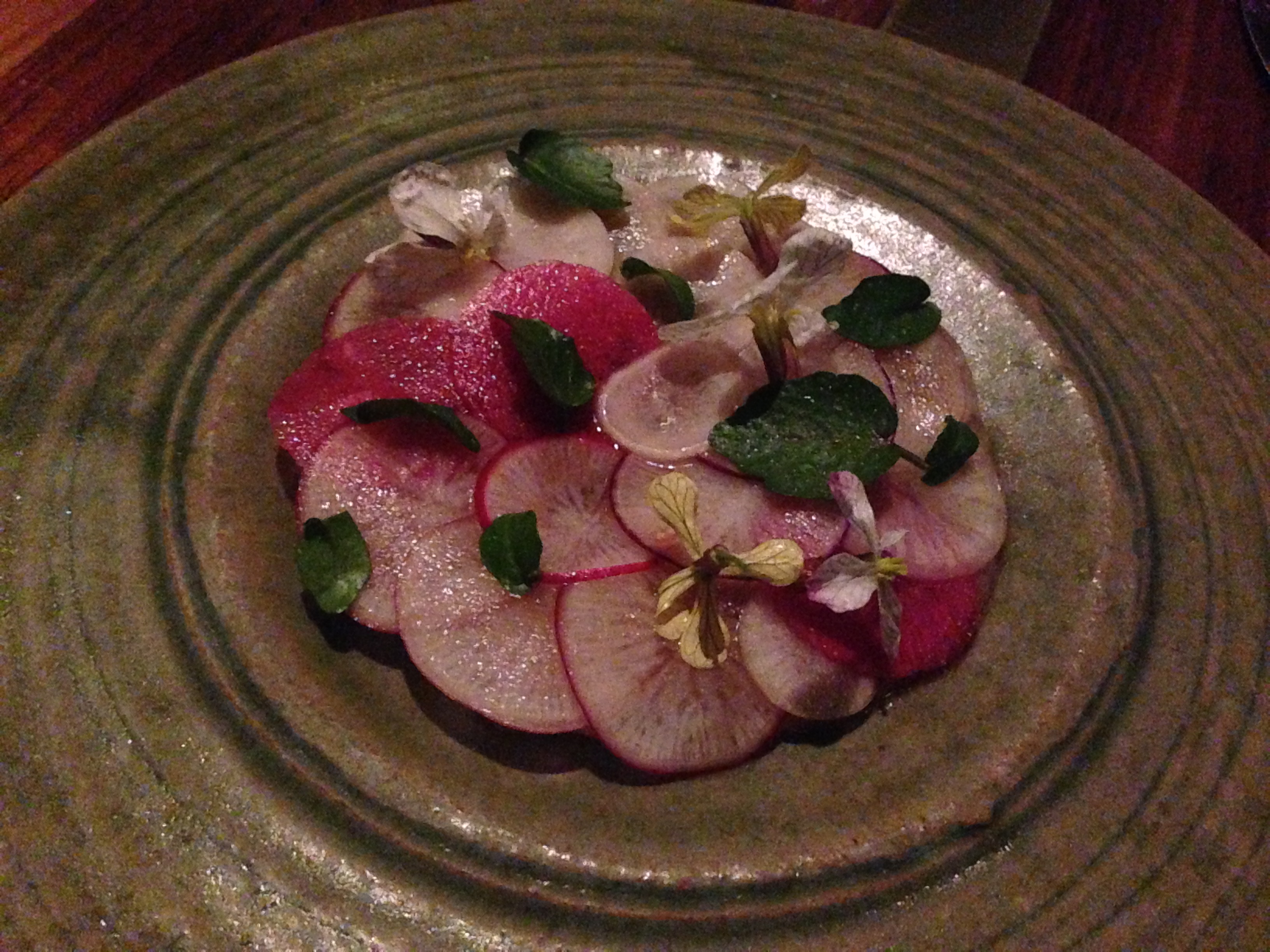 While the first couple of wines were both top quality, the 2010 Cellar Reserve Chardonnay steps it up a notch and we are starting to enter new territory. It is well made, and has aged well as a result, developing restrained honey notes that pair nicely with the marron. While the kingfish was superb, in line with the wine, the marron stepped up, whether on its own due to perfect technique, or with the beautiful buttermilk and horseradish sauce. The ice plant, which is new to me, but incidentally was on the menu a couple of nights later at Orana, is crisp but juicy, with a flavour of its own. It is a succulent that is named after the icy frost look that forms on its skin, and naturally is good with seafood given it grows in close proximity to the water.