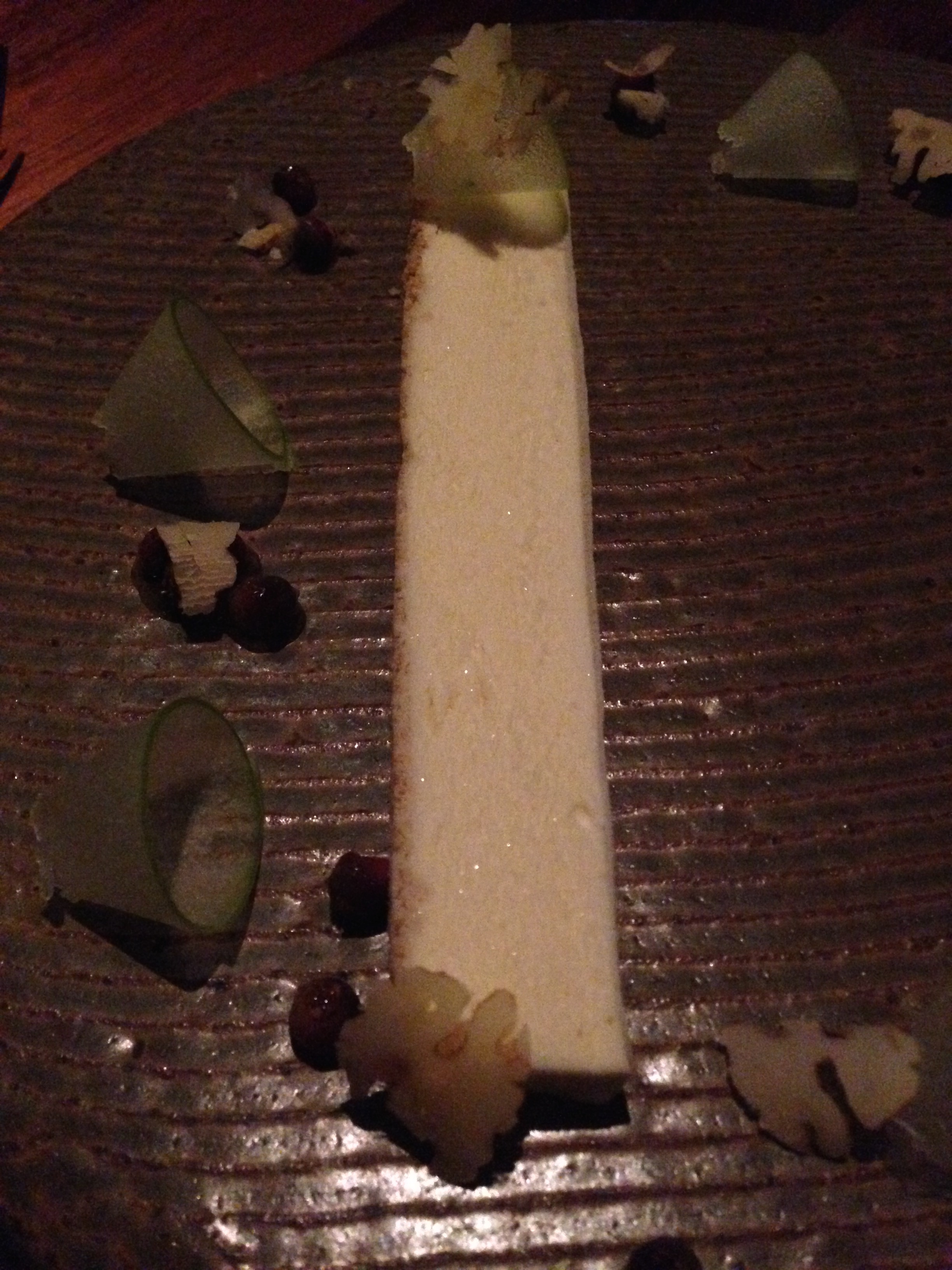 Lemon curd, Jersey cream and meringue starts our entry into dessert. It is delicious; the meringue’s sweetness easily balanced by the soft cream and curd. A pear cider accompanies the first dessert, which refreshes you for the next instalment. Beautifully presented, a long slice of baked cheesecake ice cream, comes with a good amount of pickled Granny Smith apple, and muntries. A native berry, the muntries add a burst of sourness complimenting the other ingredients, and painstakingly sliced walnut provides the final touch to a dessert both incredible to eat, and look at. The sticky Viognier is a nice match.