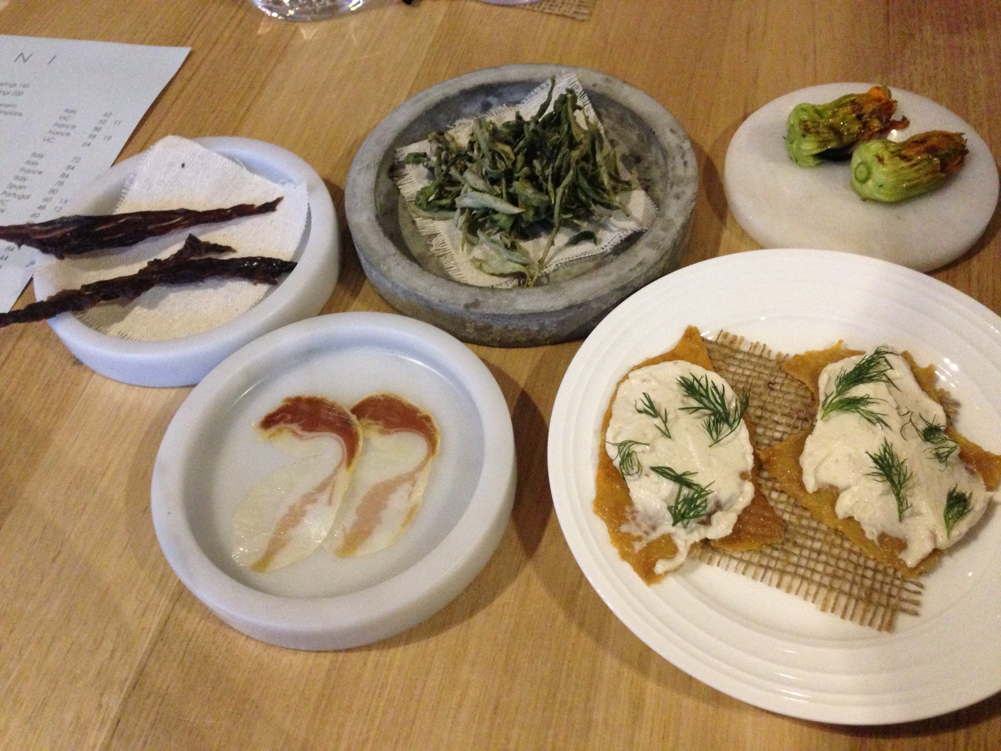 Snacks including chicken skin, salt bush and vinegar, zucchini flowers filled with a mussel, and Hopkins River beef jerky