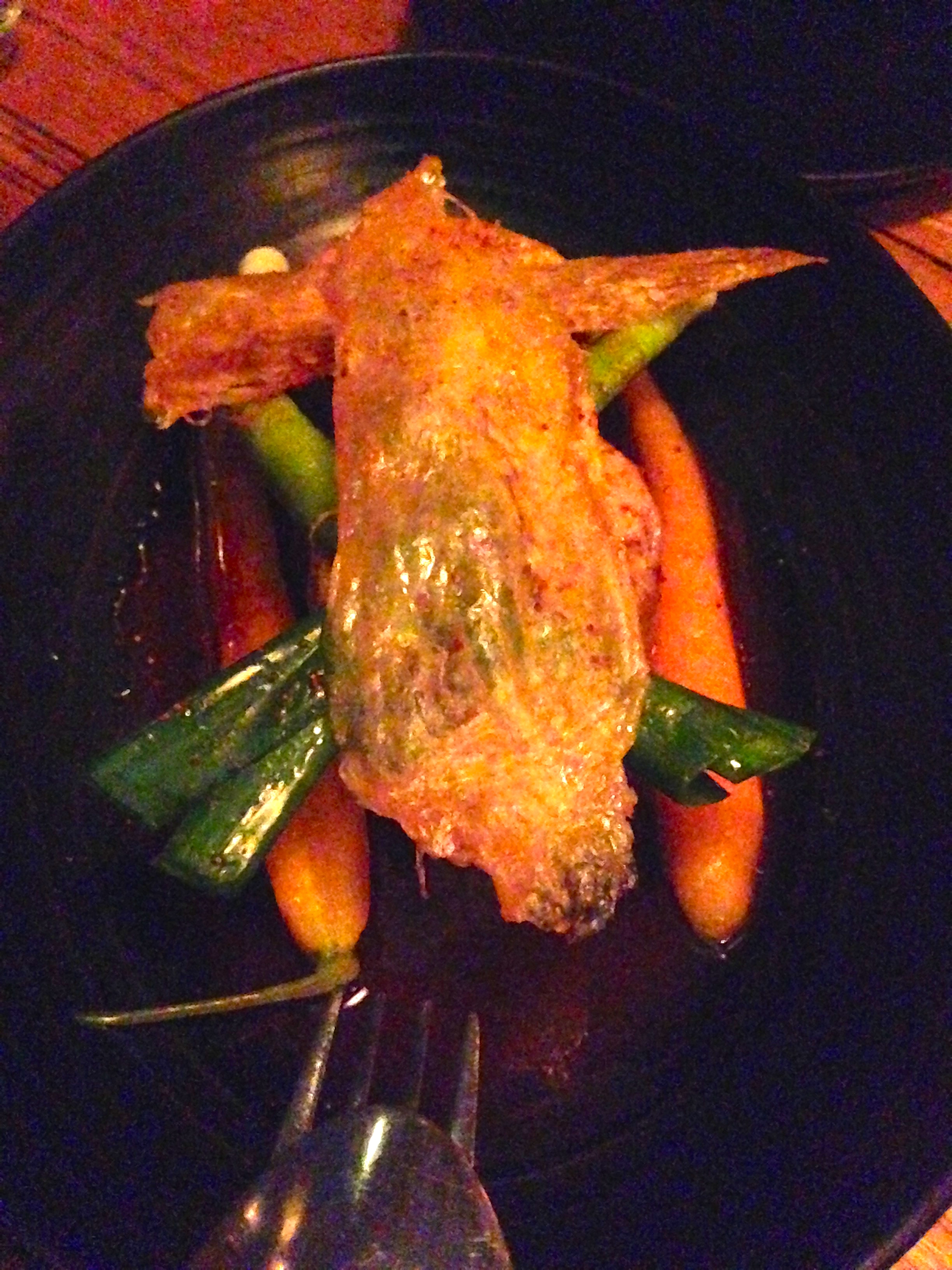For our main dishes we are presented with a great looking chicken dish featuring crisp chicken skin on top of perfectly cooked juicy chicken, with carrots, and a jus that we were going back for. It was at this stage that I started thinking it would be good to have just slightly bigger servings between the four of us. Not that the amount overall was too little, just some of the dishes were ones that you could have more than a few bites.