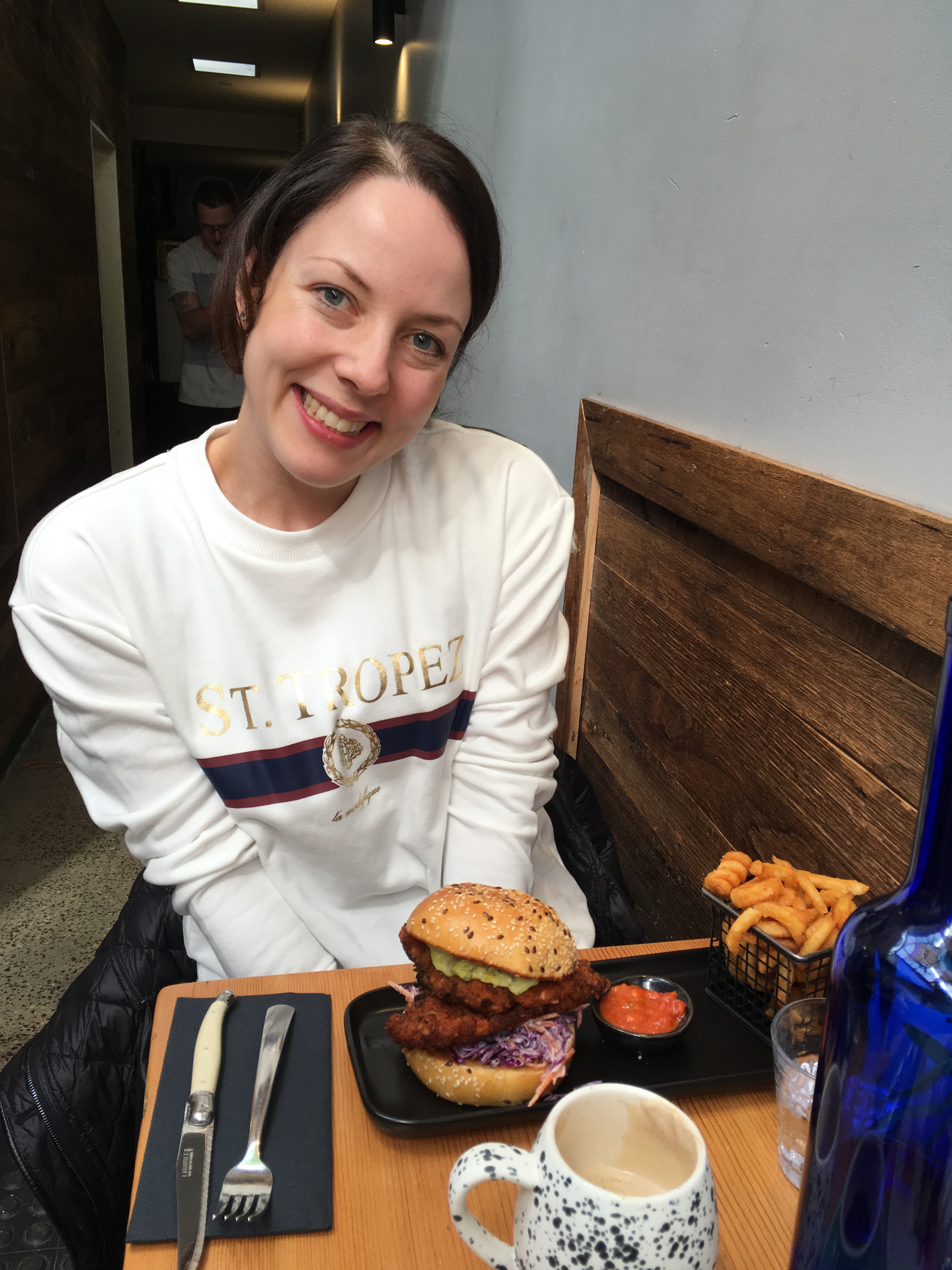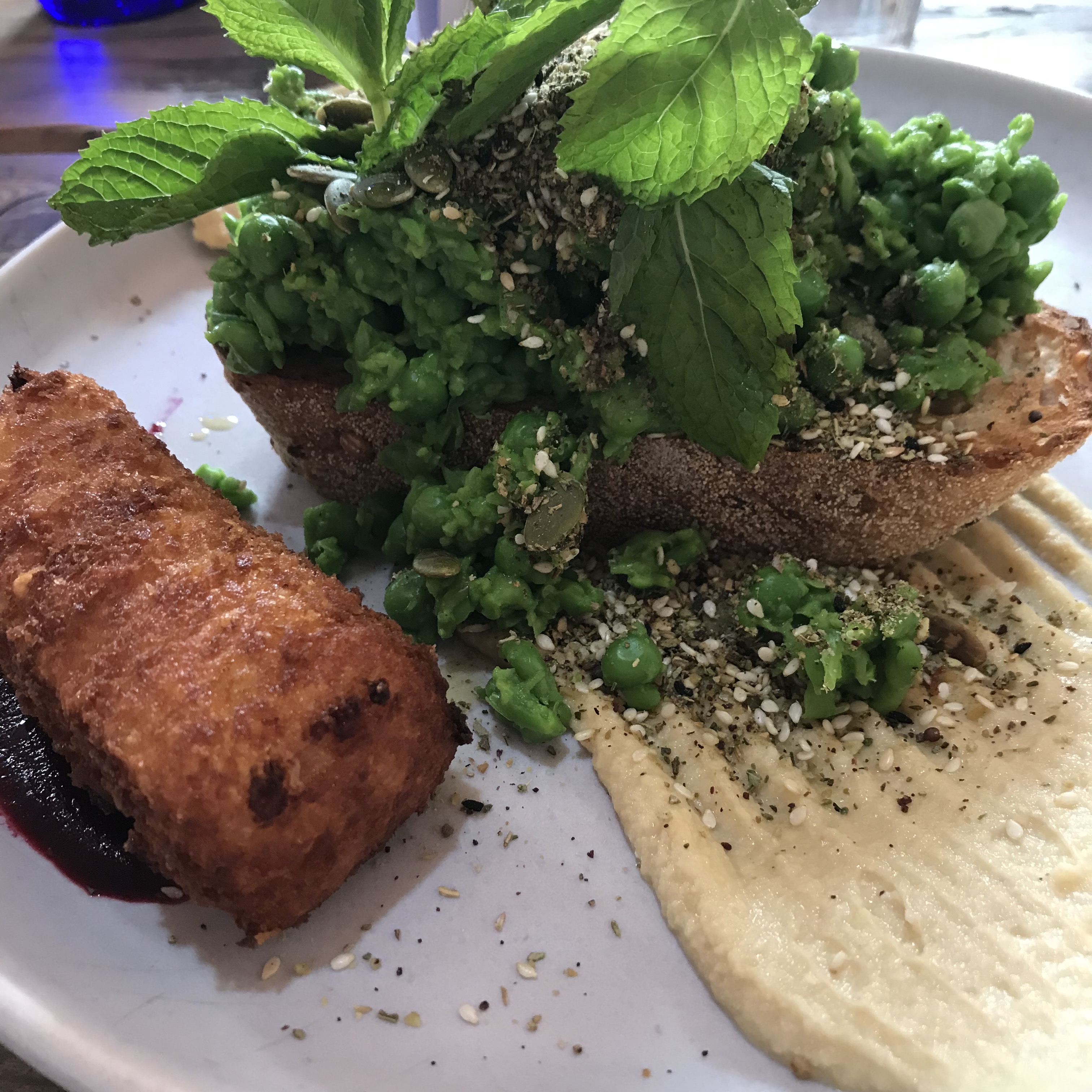 Catherine’s tried the fried chicken burger, and the pea smash a couple of times. The burger is huge; a brioche bun filled with delicious buttermilk chicken, house slaw and corn aioli. Again a generous serving, and beautifully presented, the pea smash comes with hummus, toasted pepita, and dukkah. It is flavoursome and fresh.