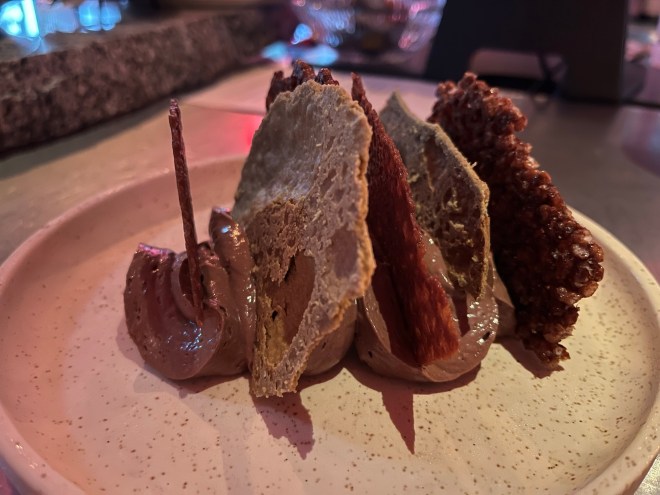 To finish I not only downed my second glass of superb Petit Chablis for the reasonable price of $22, but chose to enjoy the milk chocolate mousse topped with mint ice cream. Generously spaced and numerous assorted ‘coco pops’ wafers provide agreeable texture, to a dish that is probably best shared.