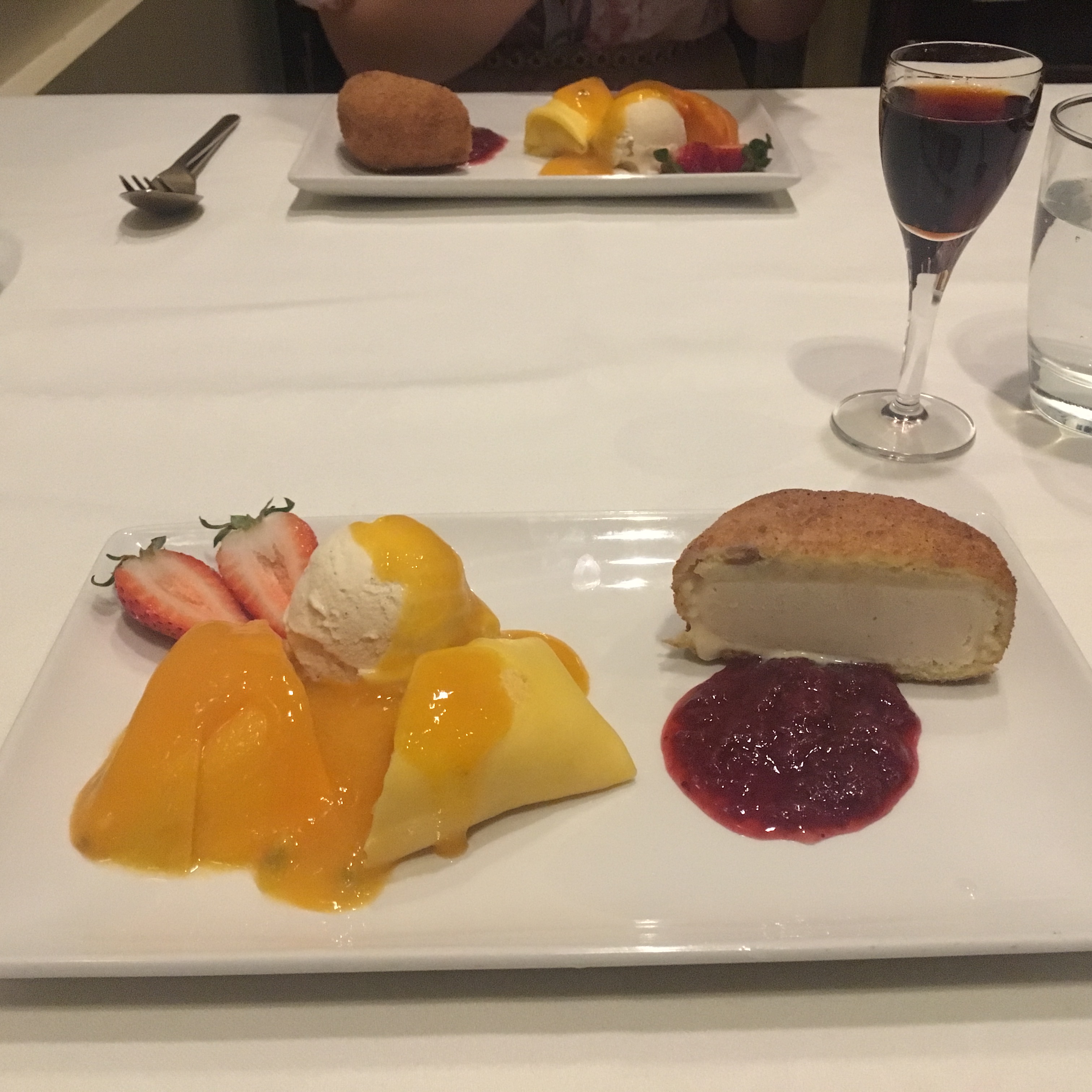 Vincent was right. Not only did he realise we were going to share dessert (so organised for it to be split between our plates) but he was spot on that fried ice cream can be elevated to an adult dessert. This one is surrounded by sponge cake that has been compressed and then surrounded by breadcrumbs. It is complimented by a berry sauce and I will never say anything bad about fried ice cream again! The crepes are very nice, just as I remember them. Plenty of sweet mango filling, even though the season in Queensland has apparently come to an end.