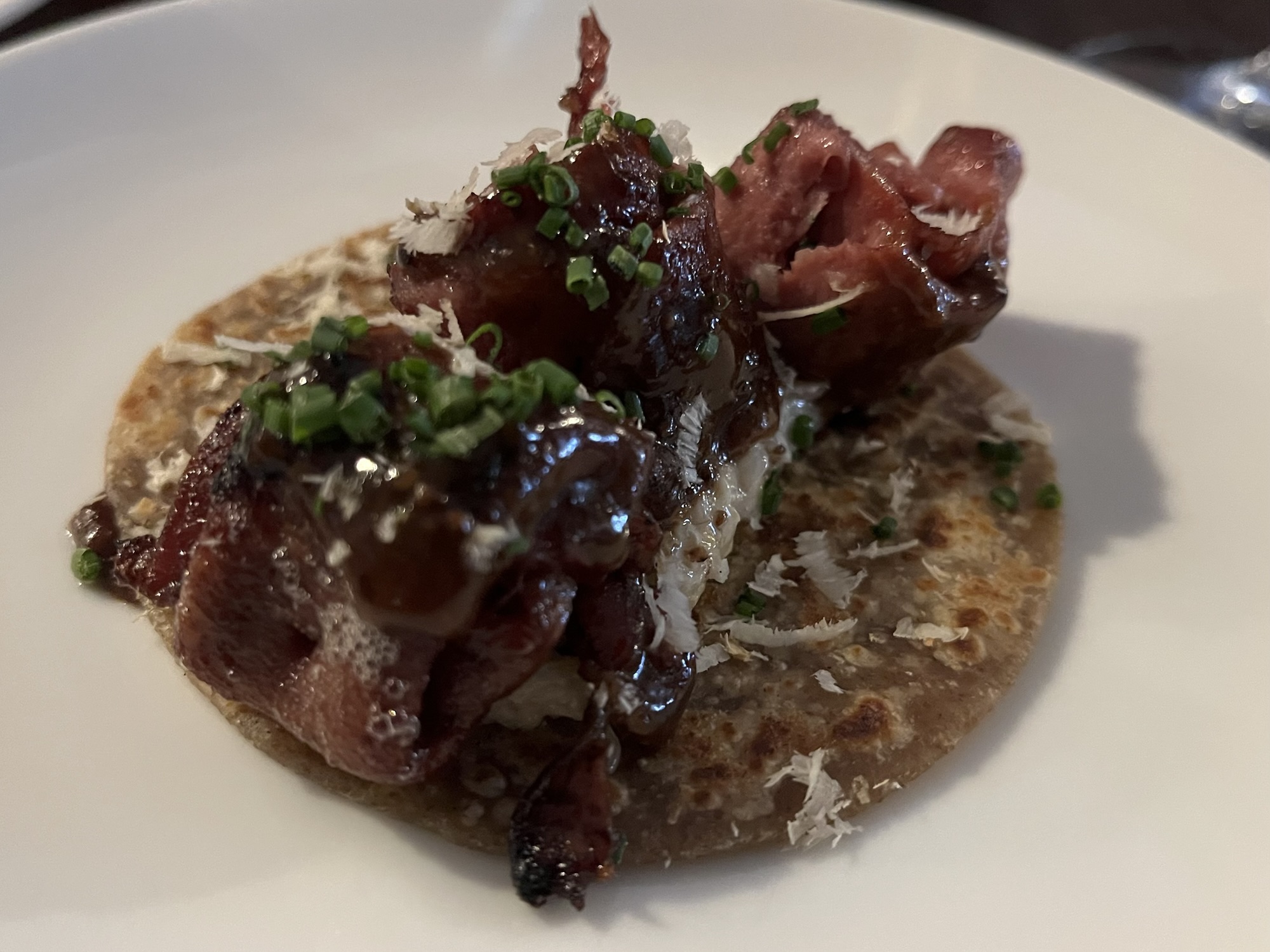 As we finish our gin garden and revolver cocktails, each delicious and inventive without going too far off course, our first set of snacks arrive. The somewhat cliched, but normally delicious baby vegetables and ferments are lifted by a salty leek-top sabayon, and every last leaf and stem is gone in no time. More indulgent, a croissant sitting in honey, is topped with a cheese rind cream, and potato skin. There’s a sense of novelty, and since it is actually my first food for the day, there’s also a sense of correctness with a croissant to begin.