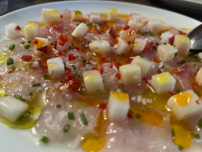 As we wound our way through some of the wines by the glass I realised there was an apparent common theme. From our sampling it struck me that the wines must have minimal intervention in the winemaking, and perhaps are organically harvested. These are not orange wines per se, but certainly had similar characteristics. It wasn’t mentioned by the sommelier so is not something that is pushed as a theme, but given the mission of the kitchen it makes sense.