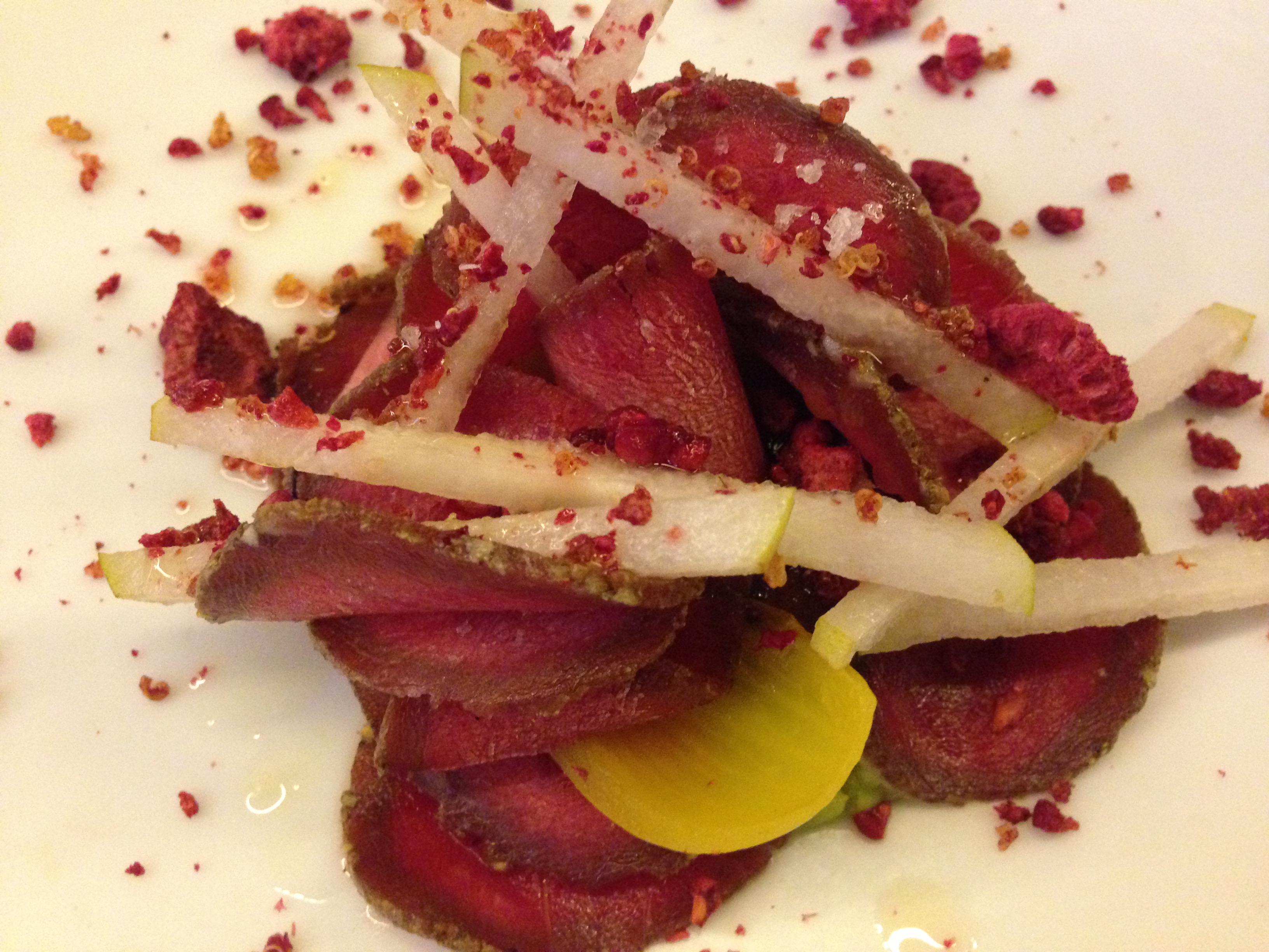 For our final savoury dish we select the lamb rump. The primary reason I was swung away from the hanger of beef with ox tongue (a favourite protein) was the Jerusalem artichoke, which I rate as my favourite vegetable. Throw in some red cabbage, a delicious sauce for the lamb, and a side of heirloom beetroot, and we are in business. The lamb, like the blue eye, is perfect. The artichokes are just the same, and unlike some other big meals, Catherine and I finish every last ingredient on our plates.