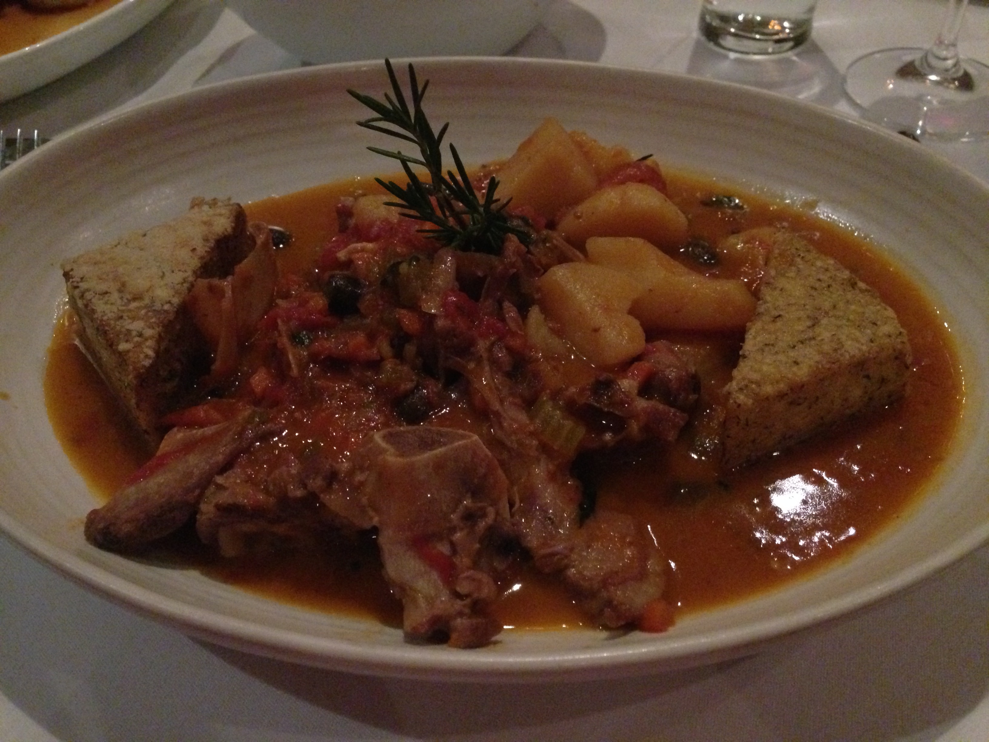 Next, as I go from a delicious Stonier Chardonnay, to an even more enticing Montepulciano, we have our mains. Mine is the Osso Bucco pappardelle, which might seem an odd choice in late December, but perfectly goes with the recent crazy cool, and often wet weather, pairing delightfully with the red. Catherine’s skull prawns with the gluten-free pasta, njuda, and ricotta, has depth of flavour, and is well executed.