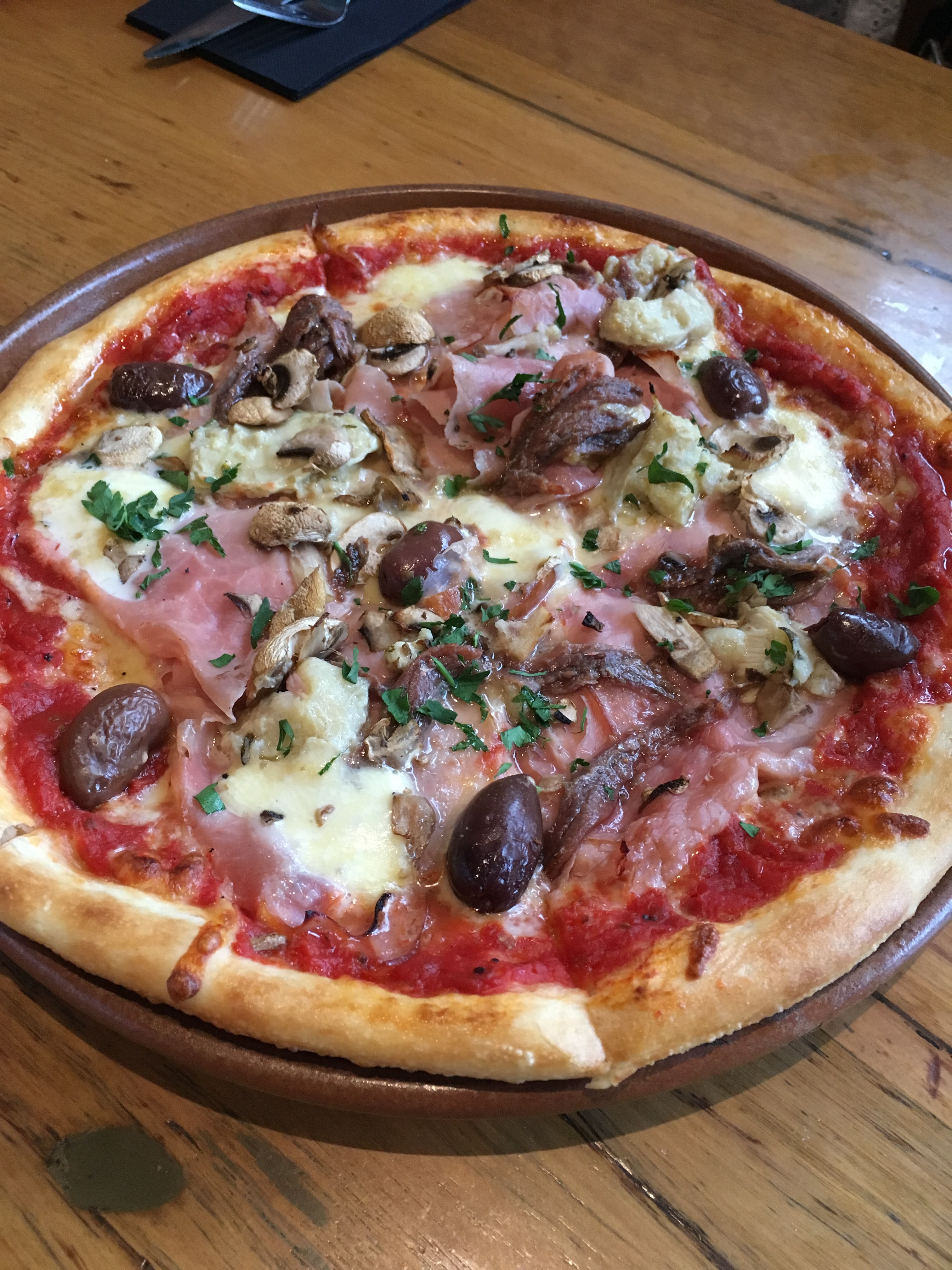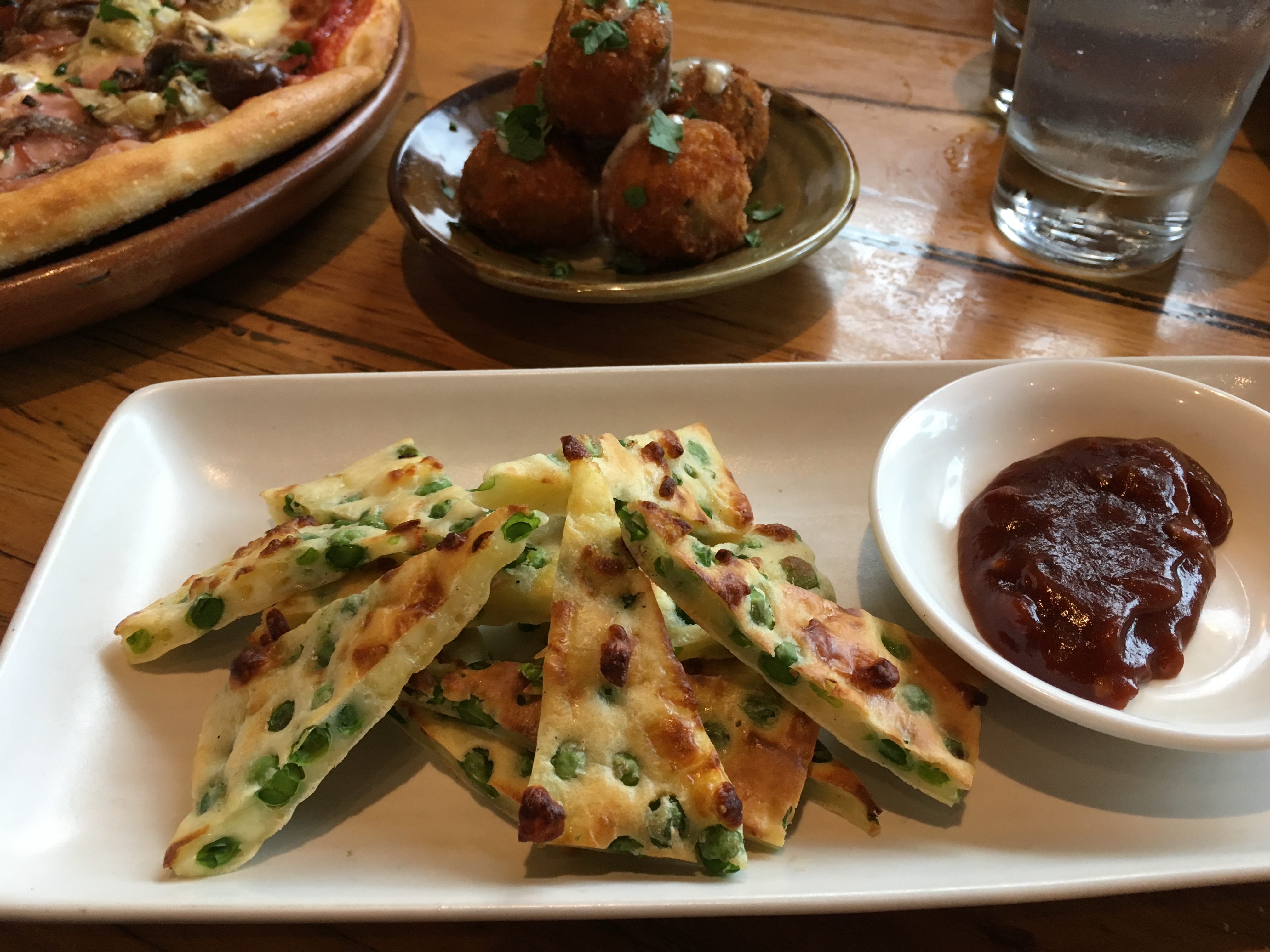 The pizza hasn’t changed here, and it was always good quality, without being amazing. Our capricciosa is a good size, with plenty of topping, and is cooked right. The arancini is great, with a good dose of gorgonzola adding to the saltiness. On the flipside, the pea and haloumi fritters are a little bit weird with not a great amount of flavour.