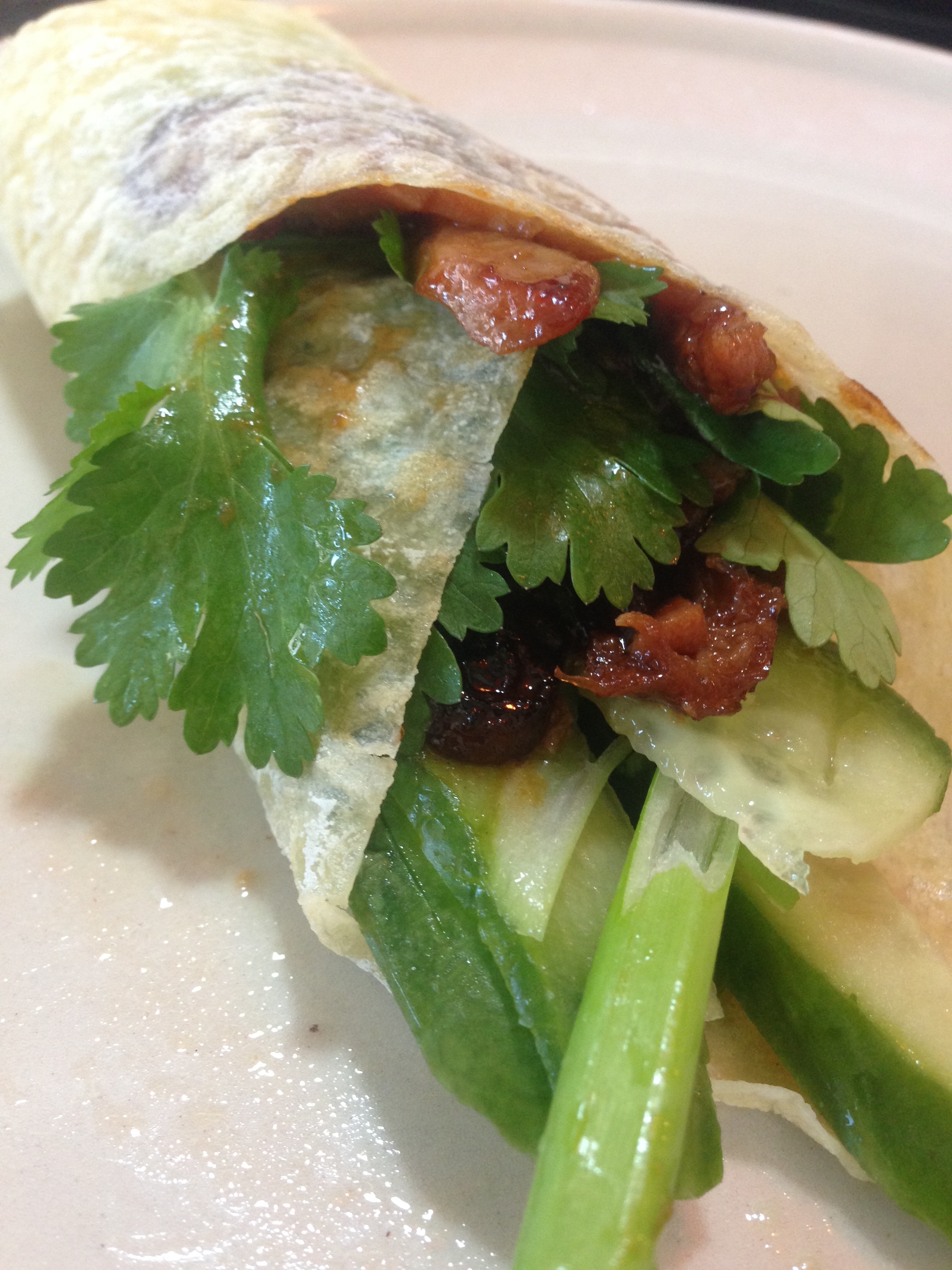 Duck pancake with spring onion, cucumber, coriander and hoisin