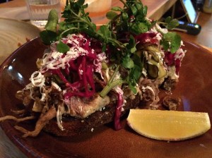 Did we linger? Absolutely! We’d started with some subtle but enjoyable cockails (Goodtime is a soft gin, Campri, grapefruit and thyme syrup combination; and I had a Blood Orange Margarita). We then moved into a Clare Valley Riesling by Carousal, and a Petit Chablis by Gueguen, before I finished with a Light Hand Chardonnay, and cleansing Land & Sea Juicebox IPA for good measure.