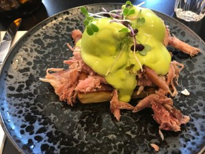 Three Bags Benedict – Poached eggs on a truffled rosti with green hollandaise, apple cider ham hock and herbs