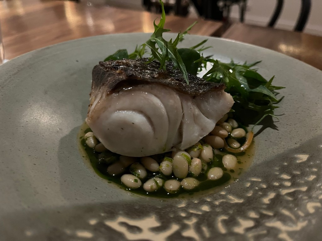 We stage mains, with the first a blue eye fillet sitting atop a stunning haricot blanc (white bean) cassoulet, that also features smoked squid that has real impact through the dish. The blue eye is perfectly cooked, and the white fleshy fish is a match made in heaven with the cassoulet. Yet another highlight.