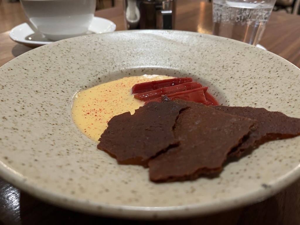 Dessert is the lesser light, but in no way diminishes the meal. Great in concept, my honey tartelette showed off the prime ingredient, but ultimately less (honey) would have been more, and more cream would have added better balance. Catherine’s rhubarb and custard, had the textural element with the brandy snap, but the rhubarb was a little tart for her taste, and knocked off the balance too.