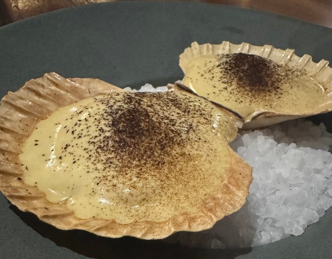 As if an entire roasted chicken is pressed and liquified, then poured into a small ceramic tea cup, over black garlic and tarragon, you are left in complete comfort, yearning for a little more, but knowing that what you’ve enjoyed is enough. Next is a softly cooked scallop covered by an utterly delectable almond and saffron sabayon, with burnt butter. Scallops in a half shell in fine dining restaurants are abundant, and this is the best one we’ve eaten this year.