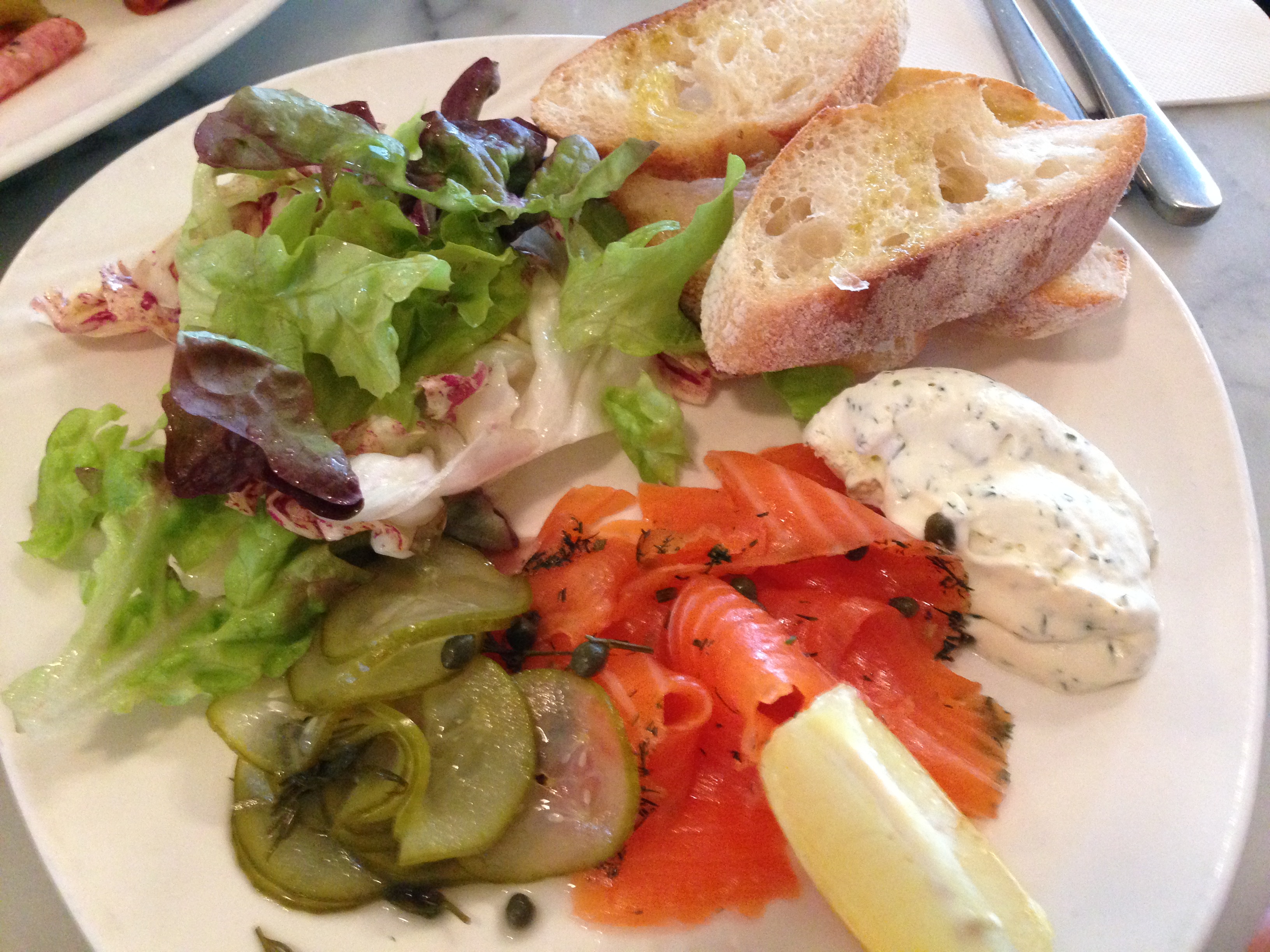 Today we are drinking from the riches of Burgundy. Catherine with a chardonnay; me with a pinot noir. As you would expect from a revolving list of twenty wines, you really cannot put a foot wrong when it comes to wine. We share the gravlax, and a salumi platter. Both very reasonably priced, the salumi selection features sausage, a softer salumi like mortadella, and mild salami. Served with pickles, and giving fresh bread, the thin slices of meat are simplicity at its best.