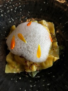 When you see “Moreton bay bug, ponzu, sake” on a menu you might think of simply the protein in a sauce given it is one of seven courses. Here that is not even half the story. The generous subtle bug meat is encased in a dumpling skin that you can only make when you are not churning them out by the dozen. It is quite simply stunning. Served with some pizazz in the form of foam, the hidden treasure meets a sauce that has you weighing up how impolite it would be to bring the bowl to your mouth. We opt to mop with some of the delightful brioche style buns being served liberally throughout the meal.