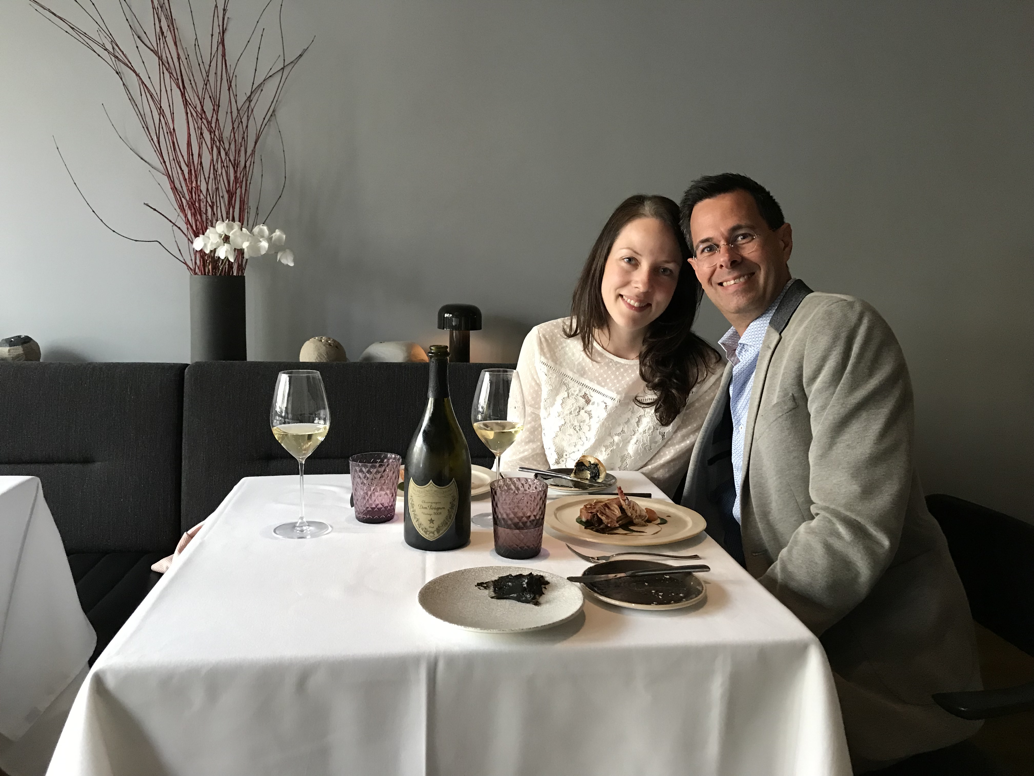 There are some very generous allowances given to us by the restaurant. Firstly we are allowed to bring a special bottle of champagne to celebrate Catherine’s birthday. Then we are allowed to substitute the cheese course for a second dessert. We are even more grateful when we taste those desserts. The first (originally the main dessert) is a perfectly bouncy panna cotta of coconut looking very pretty with its slithered almonds, rosemary and mandarin adornments. This is a carefully balanced dessert, that has enough sweetness for us, but the savoury elements are equally attractive as a combination.