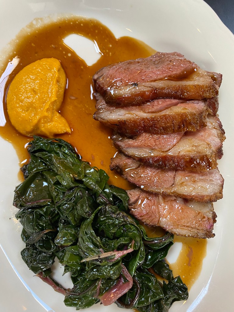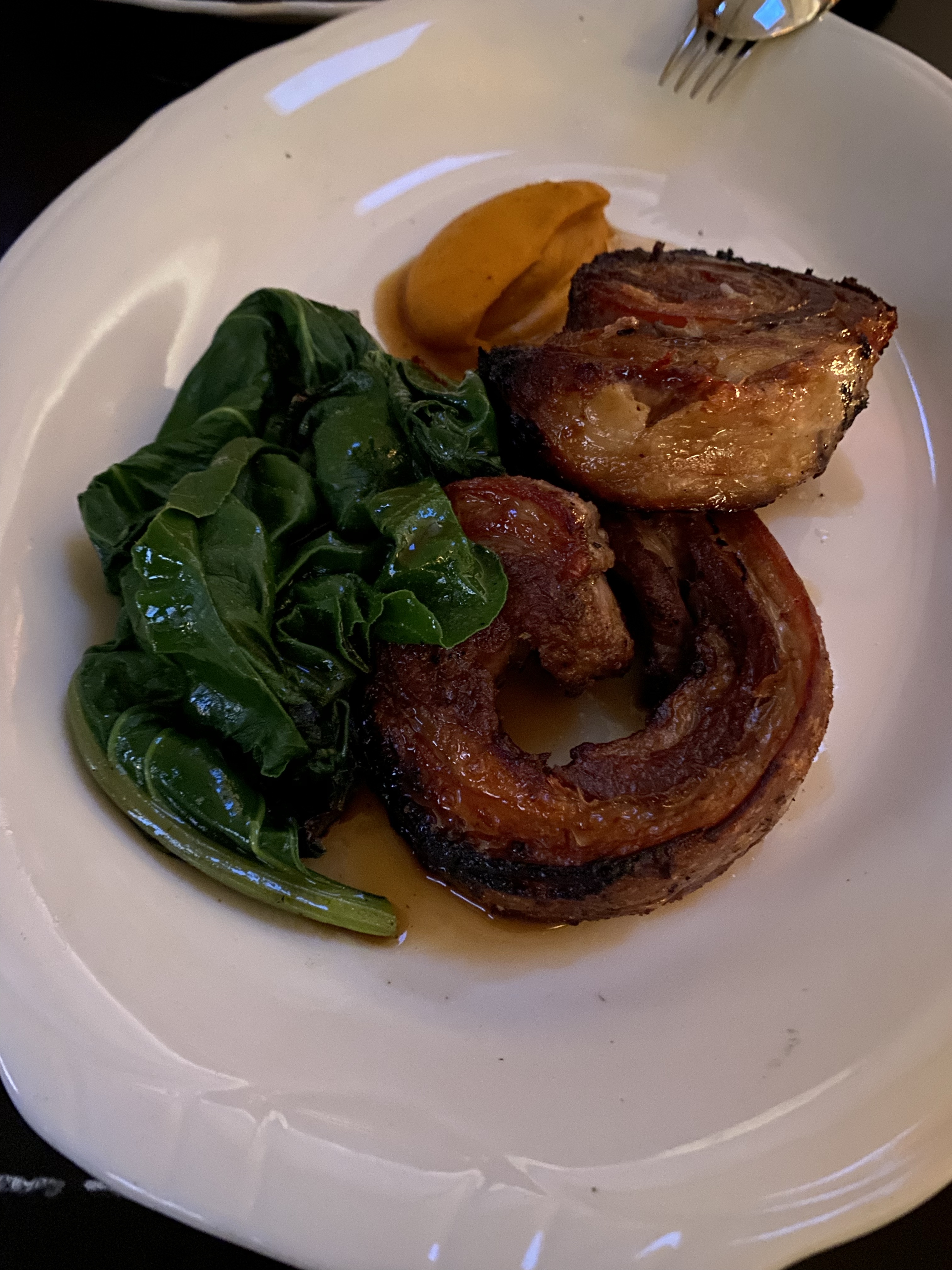 As if an entire roasted chicken is pressed and liquified, then poured into a small ceramic tea cup, over black garlic and tarragon, you are left in complete comfort, yearning for a little more, but knowing that what you’ve enjoyed is enough. Next is a softly cooked scallop covered by an utterly delectable almond and saffron sabayon, with burnt butter. Scallops in a half shell in fine dining restaurants are abundant, and this is the best one we’ve eaten this year.