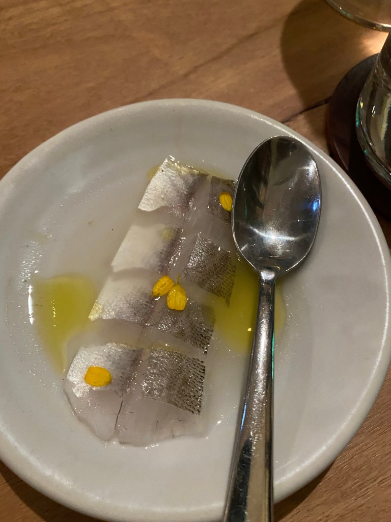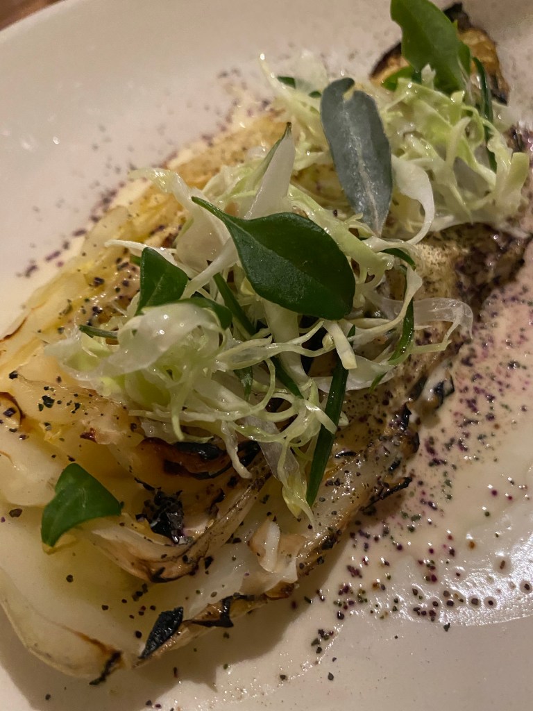 Showcasing the fresh produce of Gippsland, sugarloaf cabbage is served bathed in clam butter, with Snowy River Station seagrass. It is a thoughtful vegetable based course. By now we’ve moved on to two new white wines, with mine an Arneis by Adelina (Clare Valley) and Catherine the Cannibal Creek Chardonnay. The latter is another wine from Gippsland, and while not exclusively choosing local wines, the sommelier / wine service has done a terrific job of mixing interesting producers and varieties, and doing their best to also showcase the region where the food is centred.