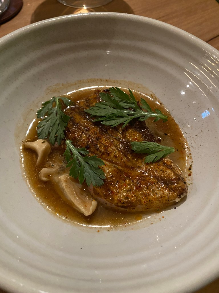 Our next course of garfish from “Campfire Corner Inlet” is a bit chewy and not to everyone’s taste. Crusted in a Japanese spice mixture called shichimi, which adds great flavour, and served with Wattle Bank oyster mushrooms, replacing the fish with many others would make for a more pleasurable dish.