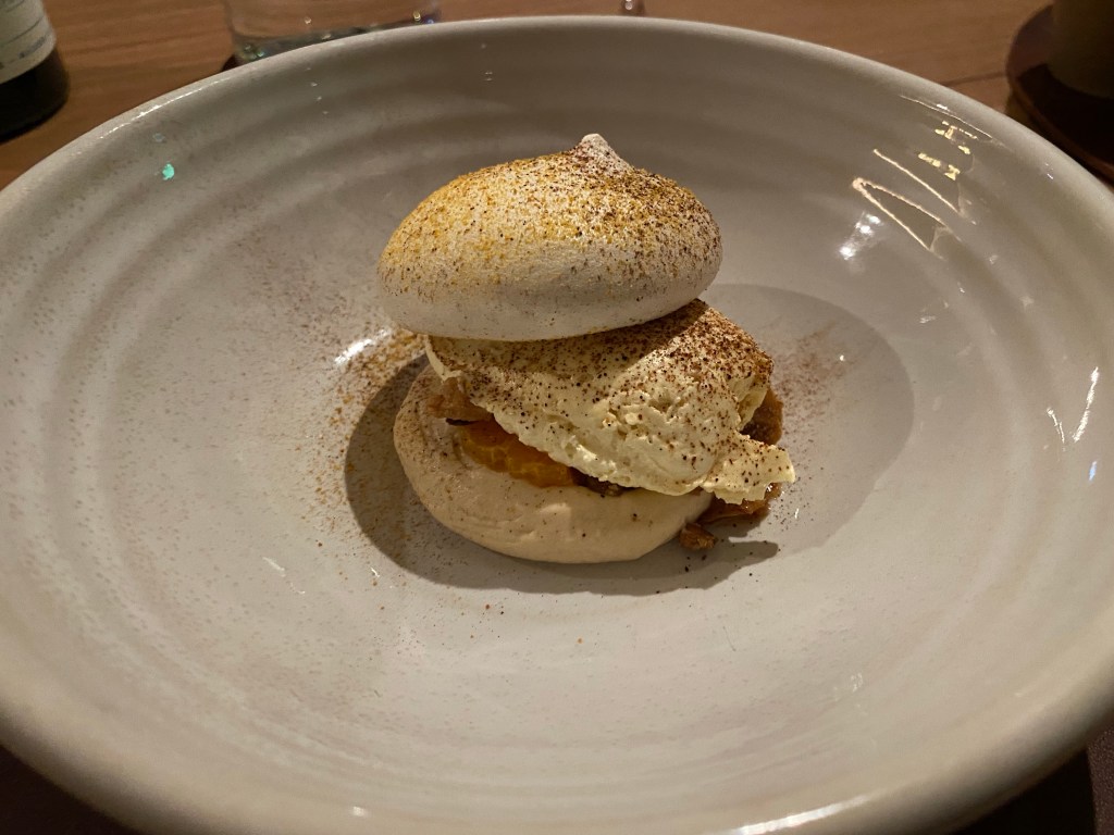Dessert is served and looks like a cross between a decadent creme biscuit and a macaron. This take on a pavlova with carob, macadamia and mandarin, has that post-crack give I like in a merengue, and enough sweetness to keep us happy. It’s clever, local, Australian themed, and a nice way to end a high quality and focussed offering from the kitchen.