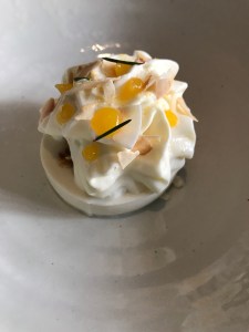 There are some very generous allowances given to us by the restaurant. Firstly we are allowed to bring a special bottle of champagne to celebrate Catherine’s birthday. Then we are allowed to substitute the cheese course for a second dessert. We are even more grateful when we taste those desserts. The first (originally the main dessert) is a perfectly bouncy panna cotta of coconut looking very pretty with its slithered almonds, rosemary and mandarin adornments. This is a carefully balanced dessert, that has enough sweetness for us, but the savoury elements are equally attractive as a combination.