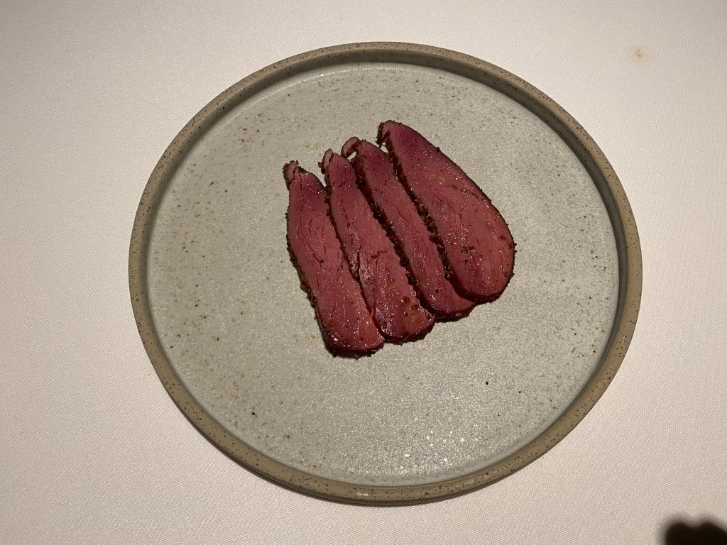 For once, the weakest dish is the first, surprisingly as I normally love any crab. Here spanner crab is treated uniquely, and while beautifully presented, it doesn’t cut it for me, but everything else does. Next I have the tataki kangaroo that I was talking about earlier, with purple turnips. It is brilliant. Kangaroo is becoming such an iconic dish in Australia, and more and more places are doing it well. In this case, doing it well includes the chef cutting it right in front of me with a very sharp knife and letting it rest for what must have been at least fifteen minutes. Added are precisely cut purple radishes after they have been subjected to severe heat. It’s the yeast dressing with wasabi oil that brings it all together so brilliantly.