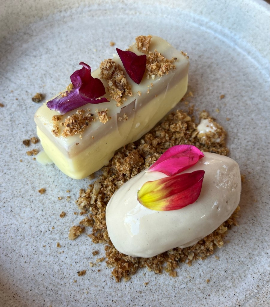 After our walk around the native and vegetable garden, we sat for our strongly flavoured coriander and celery refresher, that had a lift from the spice, and a certain addictive quality. Next we braced ourselves for a more balanced dessert, but were pleasantly surprised when the “Yesterday’s bread” turned out to be a fascinating take on bread and butter pudding, that shone from both a presentation, and flavour perspective. The toffee coating on the pudding, the use of lemon in several elements, and the creme fraiche providing a heavenly dessert.