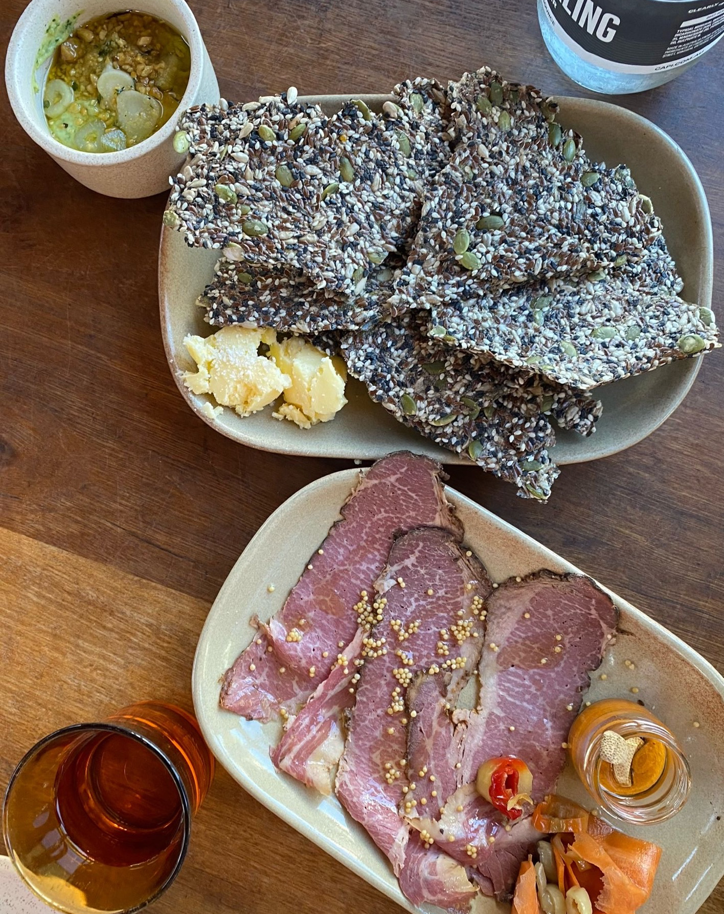 The next snacks turn it up a notch with a hogget kofta on a skewer, sidling up to sheep’s milk labneh; and smoked beetroot dip (kibbeh nayeh), topped with bresola made in-house. The take on the usually raw meat of the kibbeh nayeh with beetroot is tremendous, sourdough smacked with butter providing the perfect vessel to assemble the flavoursome combination. The hogget (yearling sheep) has some expected chewiness, but not in a challenging way, and the labneh dip softens the fattiness nicely.