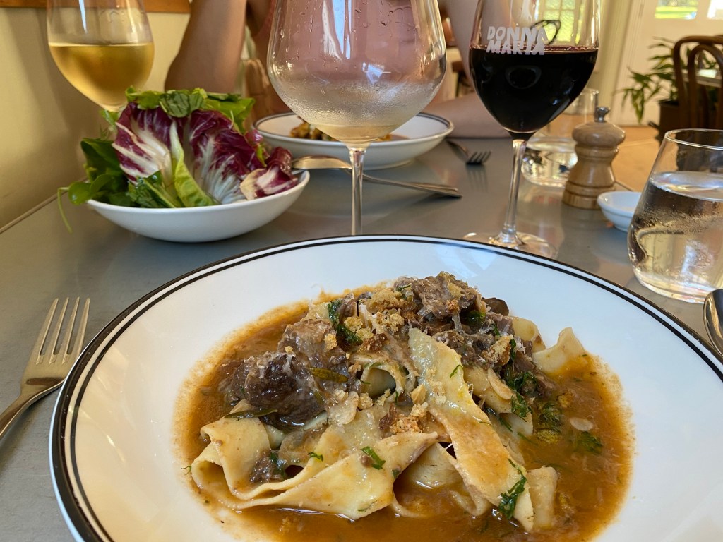 We were not alone by any stretch on the terrace. There was at least half a dozen tables finishing their meals in the heat, and others attempting to beat the dining window inside. At no stage was there any apology for the longer waits between courses, or for the stretching of the service team. In fact, I had to ask for my wine to be refilled with our bottle at the waitperson station so many times that Riccardo joked I was “thirsty”. The issue was each refill was three sips, and I like to drink a little after each mouthful. It is a winery after all.