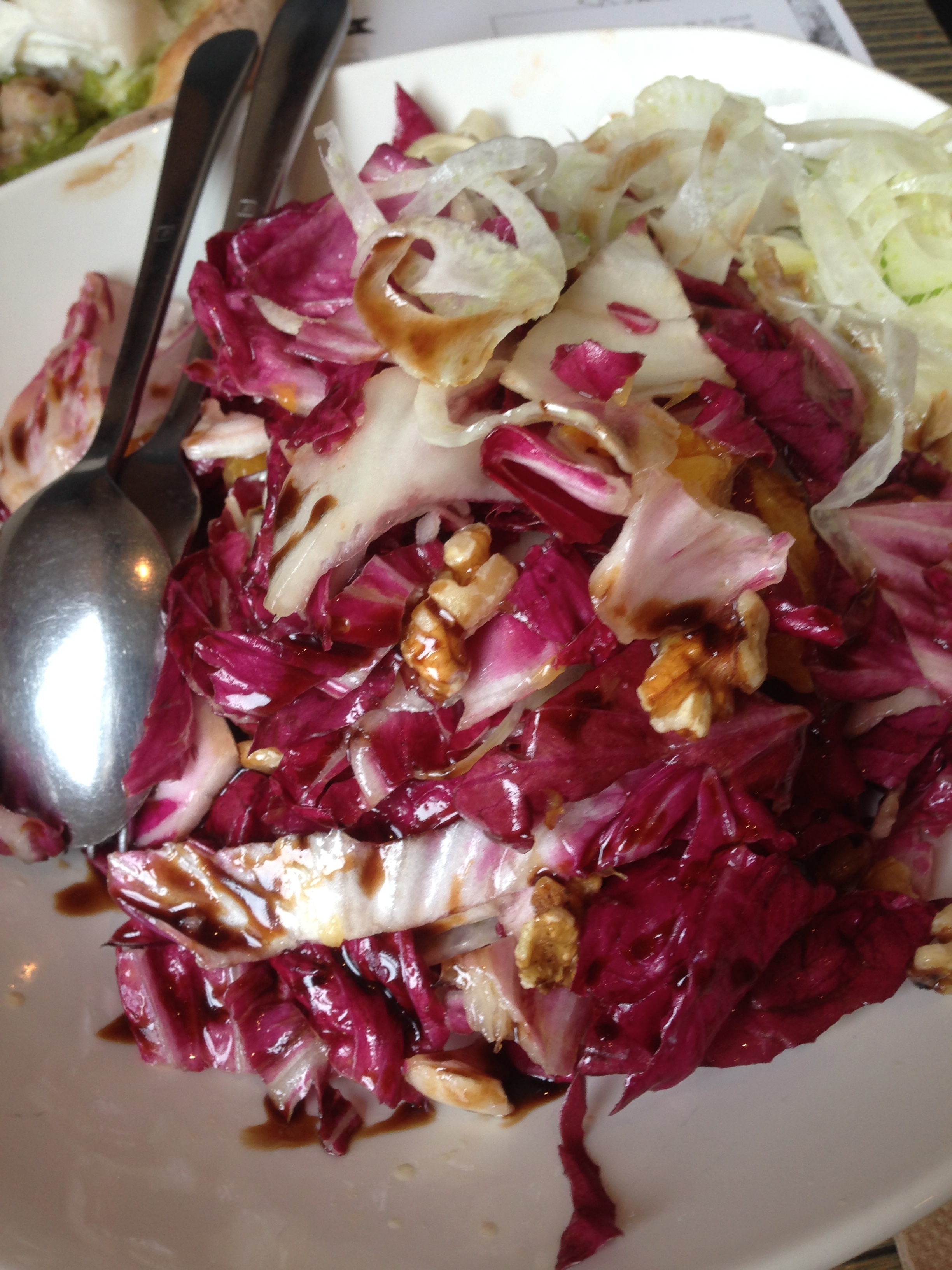 It is time to start eating and I have done an extremely gentlemanly gesture and ordered one of the two dishes that Catherine couldn’t choose between. The “Barbara pumpkin angolotti” consists of one large piece of al dente filled pasta, simple but delicious pumpkin, with balance to the creaminess provided by lemon, and a nice infusion from sage. Catherine was torn but ordered the pan seared scallops. Large, beautifully seared scallops, slightly translucent, are served with a lovely parsnip puree. The lentil salad seems an unusual accompaniment but it works alongside the bitter leaves which are a more regular compliment.