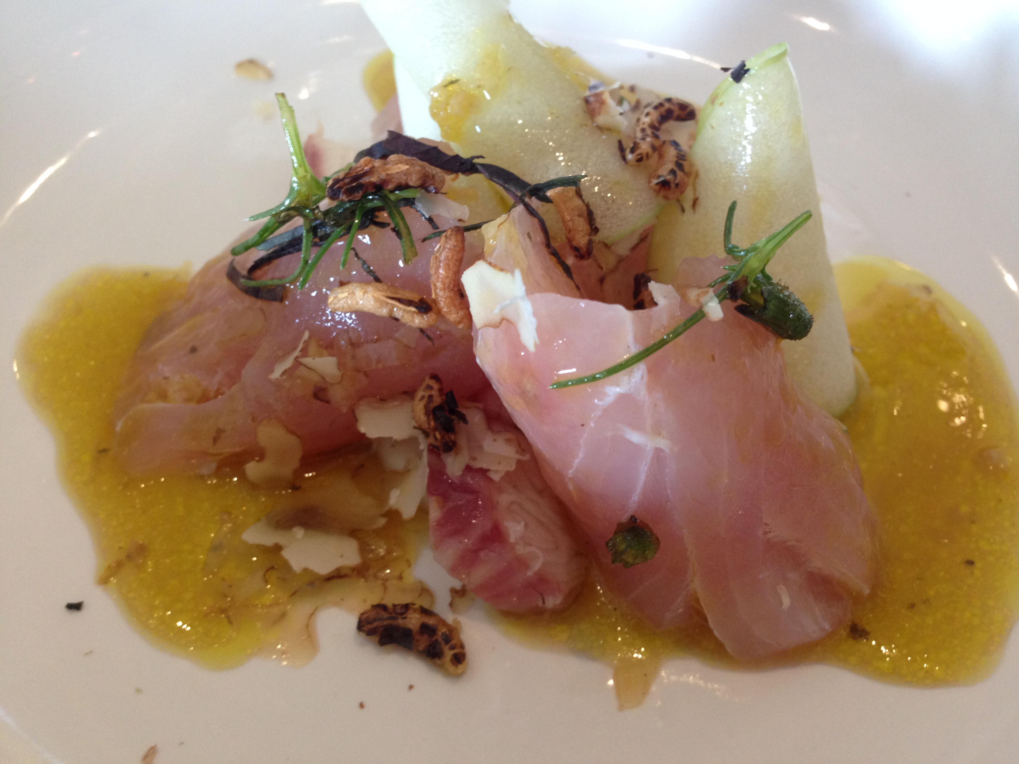This feeling in the dining room requires a start of Champagne and Perrier Jouet seems just right. Luckily it goes beautifully with the amuse bouche, which is a delicious diced tuna concoction complete with foam for a bit of pizzazz. Next up is our first course of Kingfish from Bateau Bay with smoked eel, shiso, walnuts and apple. Guillaume spells out where each star ingredient is from, and it shows the care and pride taken in his approach to sourcing. Looking at the size of this dish we take a deep breath knowing we probably should not have eaten breakfast, and a bircher muesli at that! In any case, each bite of the generous portion of kingfish is delicious and the combination with smoked eel works along with the classic apple and walnut flavours, and a gorgeous lemon sauce. If nothing else, a touch more apple for each bite would be good, but this is a fantastic start to the meal.
