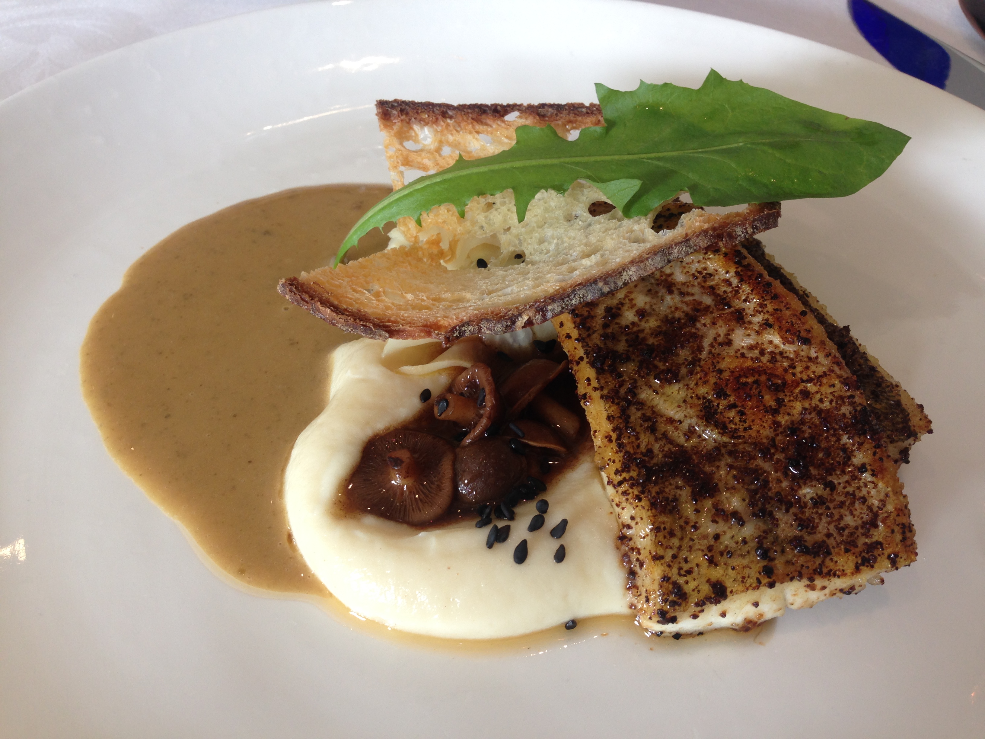 By this stage we had moved on to the Paringa chardonnay, which naturally suits the next course. From Port Lincoln in South Australia, the King George Whiting is extremely exciting. This is one of my favourite fishes, but it needs accompaniments that lift it given its subtle flavour. The whiting itself is perfectly cooked, but the accompaniments of celeriac puree, and the sauce, whilst good, was not the quality of the previous dishes. The dish needed texture, but it was a bit fiddly with the crisp bread. There is some work to do.