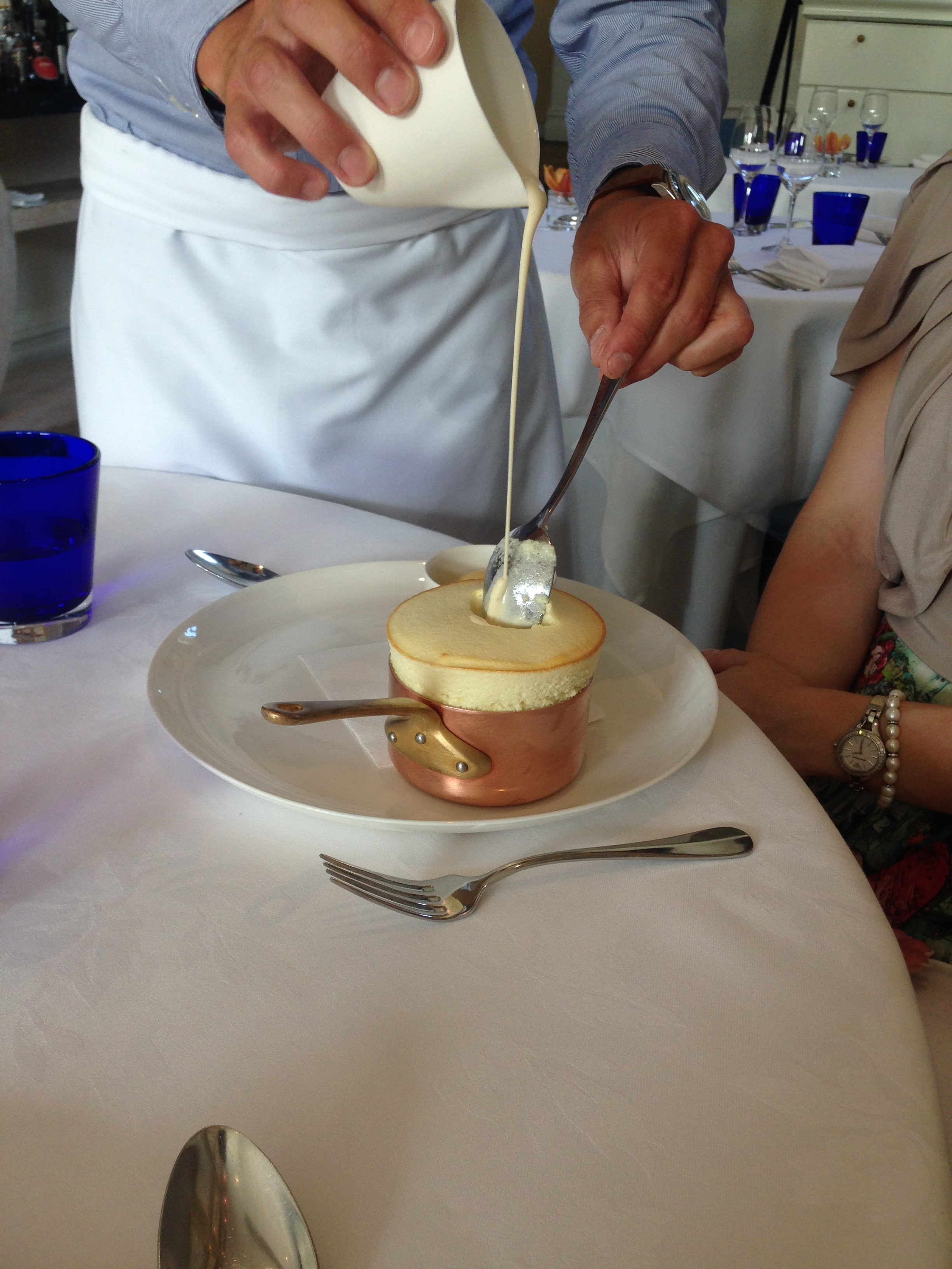 The next dish was something else though. The wagyu beef from New England in New South Wales is stunning. Paris mash is served at the table from the fancy saucepan. This mash and the turnip puree are outstanding accompaniments, and the jus is delightful too. Adding to the finesse of the dish is a glorious wine from Saint-Emilion combining merlot and cabernet franc in the best possible way, with just the right age to work with the beef.