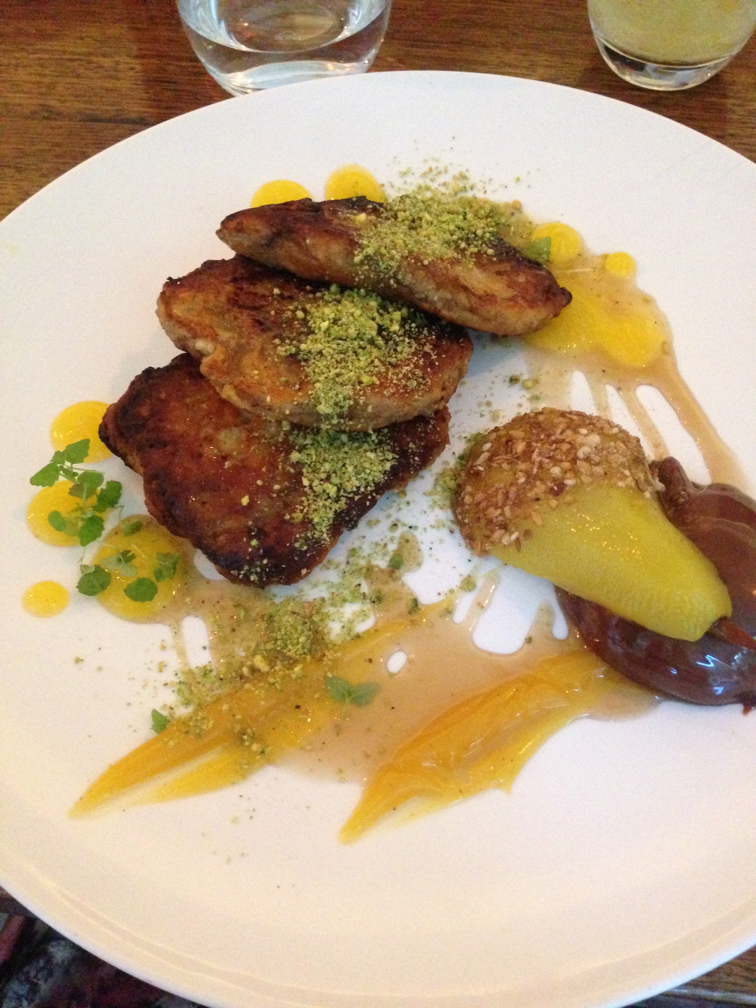 Pink Lady apple, buckwheat & ricotta pancakes, nutella, orange, spiced pear, mandarin gel, pistachio crunch