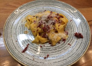 Next, as I go from a delicious Stonier Chardonnay, to an even more enticing Montepulciano, we have our mains. Mine is the Osso Bucco pappardelle, which might seem an odd choice in late December, but perfectly goes with the recent crazy cool, and often wet weather, pairing delightfully with the red. Catherine’s skull prawns with the gluten-free pasta, njuda, and ricotta, has depth of flavour, and is well executed.