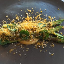 Next we have a dish presented where the components are bursting from the plate. It could be an Olympic dish for the Australian’s with its green and gold flourishing from the use of asparagus and nasturtiums on the one hand; and lemon and egg on the other. While lemon hollandaise is a classic combination, the sweetness here was a little too much for me by the end, but Catherine was a big fan of the almost lemon curd like sauce.