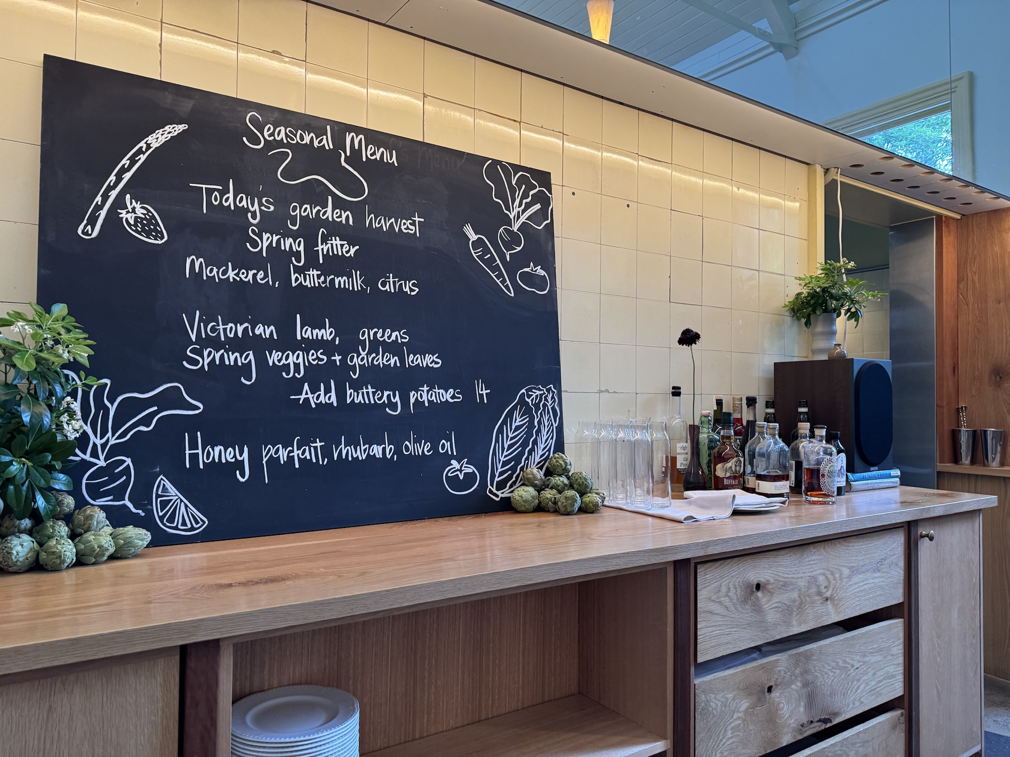 I love the feeling you get when a restaurant is going well, and the staff enjoy working there. From the time you enter, through to the farewell, there is a sense of comfort. There’s something clever from the kitchen too with the way the tasting menu works. The menu is on a blackboard showcasing the main dishes for the incredibly reasonable price of $85. Then there are a host of additions depending on your appetite, and tastes. Oysters, beef tongue, zucchini flower, and coral trout are all options on another blackboard to the left.