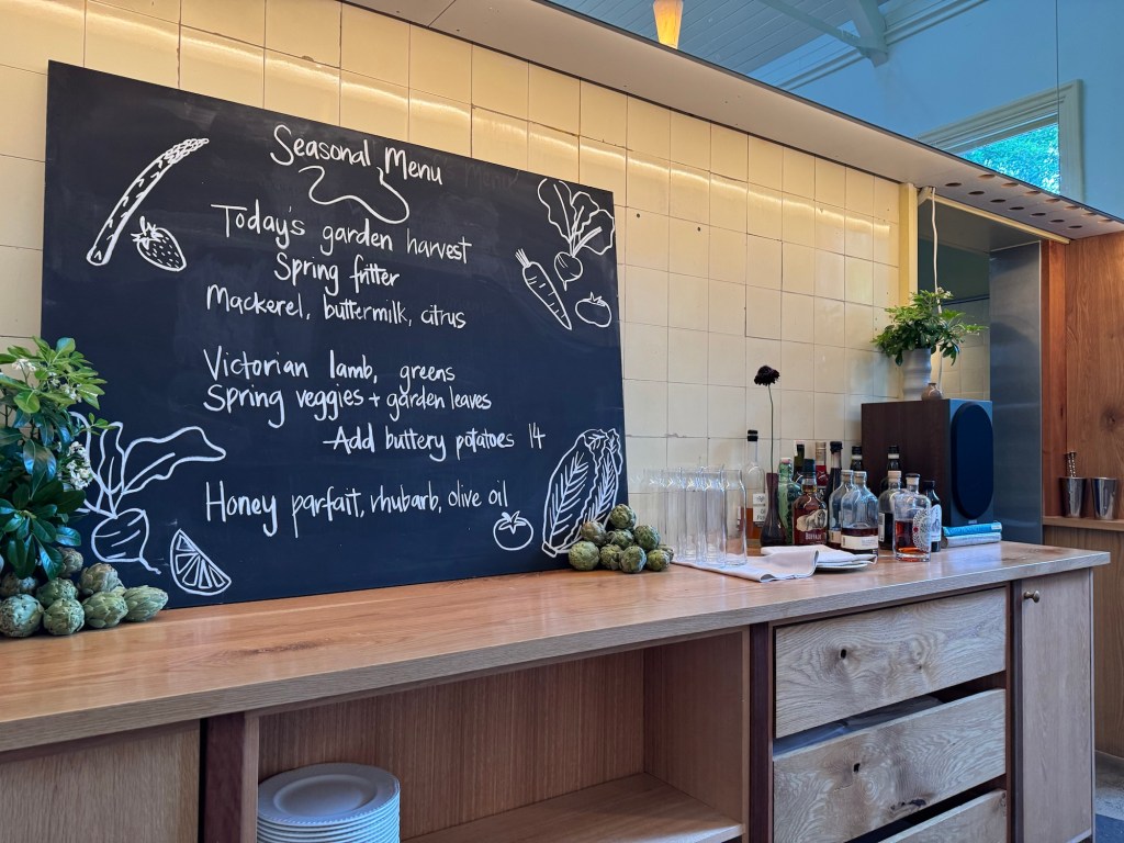 The main bar and kitchen in the entry is the old barn, and the restaurant is an addition with a vaulted ceiling. Long glass panels give you a sense that you are almost in the beautiful native garden and backdrop of fire-touched trees on one side, and the kitchen garden to the other. The fireplace is a stunning feature, carefully placed firewood lining high on both sides. It’s extremely well thought out. A fine dining room at its best.