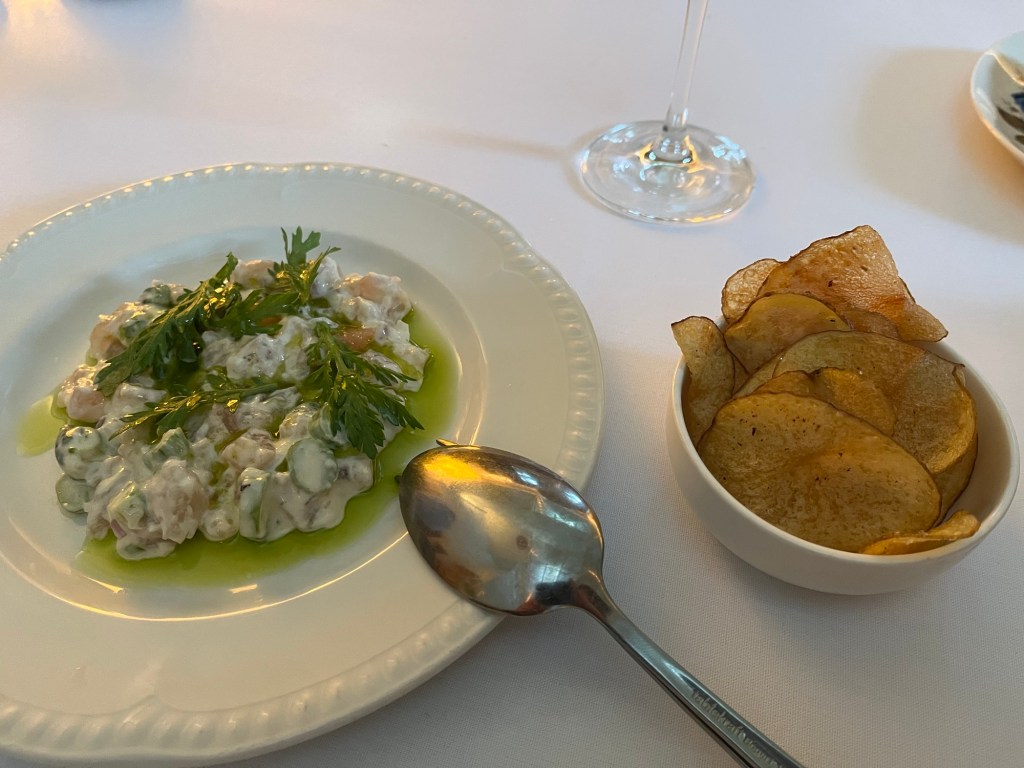 We feel a bit late to the party, as Julie Restaurant opened in September 2023, but better late than never. As we arrive it is a cool early evening for the mid part of Spring, and we note the outdoor tables on the terrace for a future a la carte meal, or a drink, on a warm night. Inside, the white space is quite small, but the high ceiling reaches upward creating an airy space for the dozen or so tables. Many of the tables, including ours, face the opening to the kitchen pass. In that window, chef Julieanne Blum in turn faces the restaurant whilst controlling the quality of the kitchen, and communicating with the terrific floor staff.