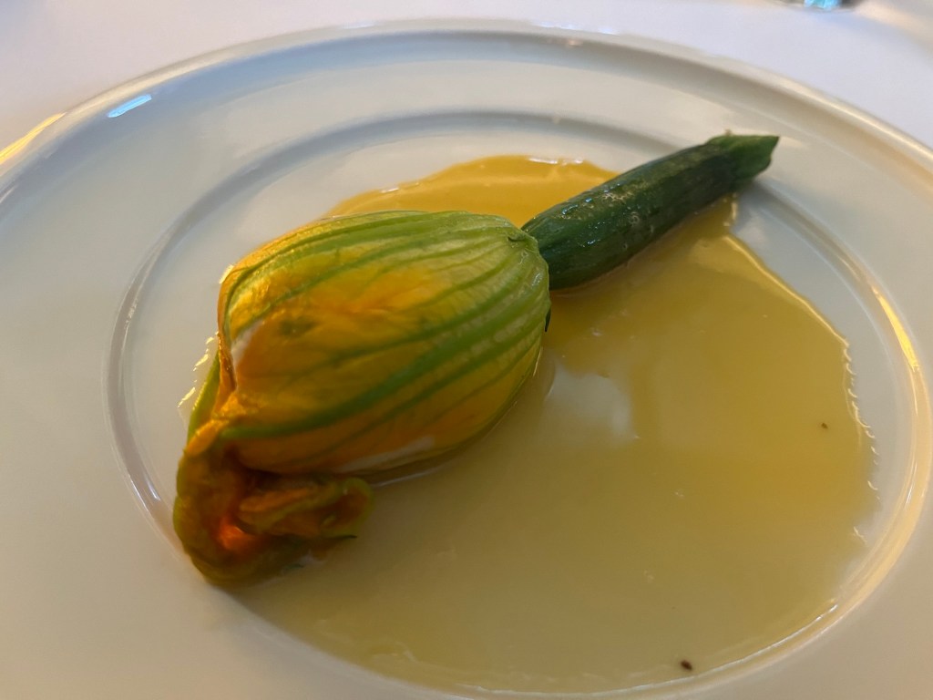 As well as adding in the beef tongue, and the zucchini flower, we also opt for the buttery potatoes, not because we need them, but because we want them! As we enjoy our excellently executed aperitifs, a house martini for me, and a Campari spritz for Catherine, our obligatory platter of vegetables, preserves, and dip, arrives on the table. This is becoming a clichéd beginning to a farm to table / seasonal restaurant, but we normally enjoy them, and this one is worthwhile. The vegetable fritter served next is packed with oily goodness, and perfectly handled in the fryer to add a different element to the other starters. Housemade sourdough accompanies as a treat in itself.