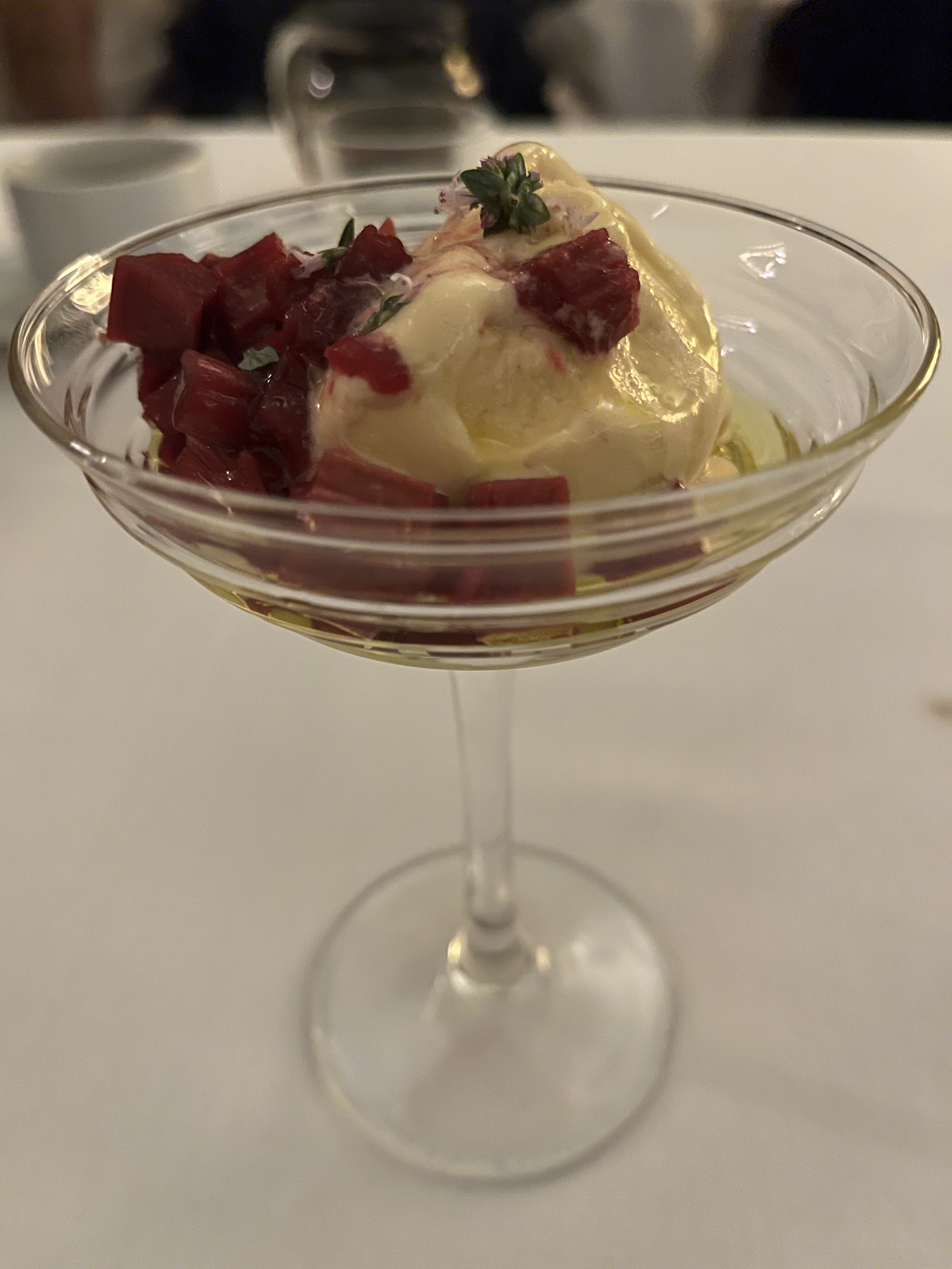 It was time for dessert and it had been impossible to miss seeing a bunch of good looking concoctions going out in the same glass I had earlier enjoyed my martini from. Here you have a rather savoury leaning dessert with good balance. There’s just enough sweetness in the honey parfait topped with thyme and rhubarb; salt and olive oil show through as key ingredients.
