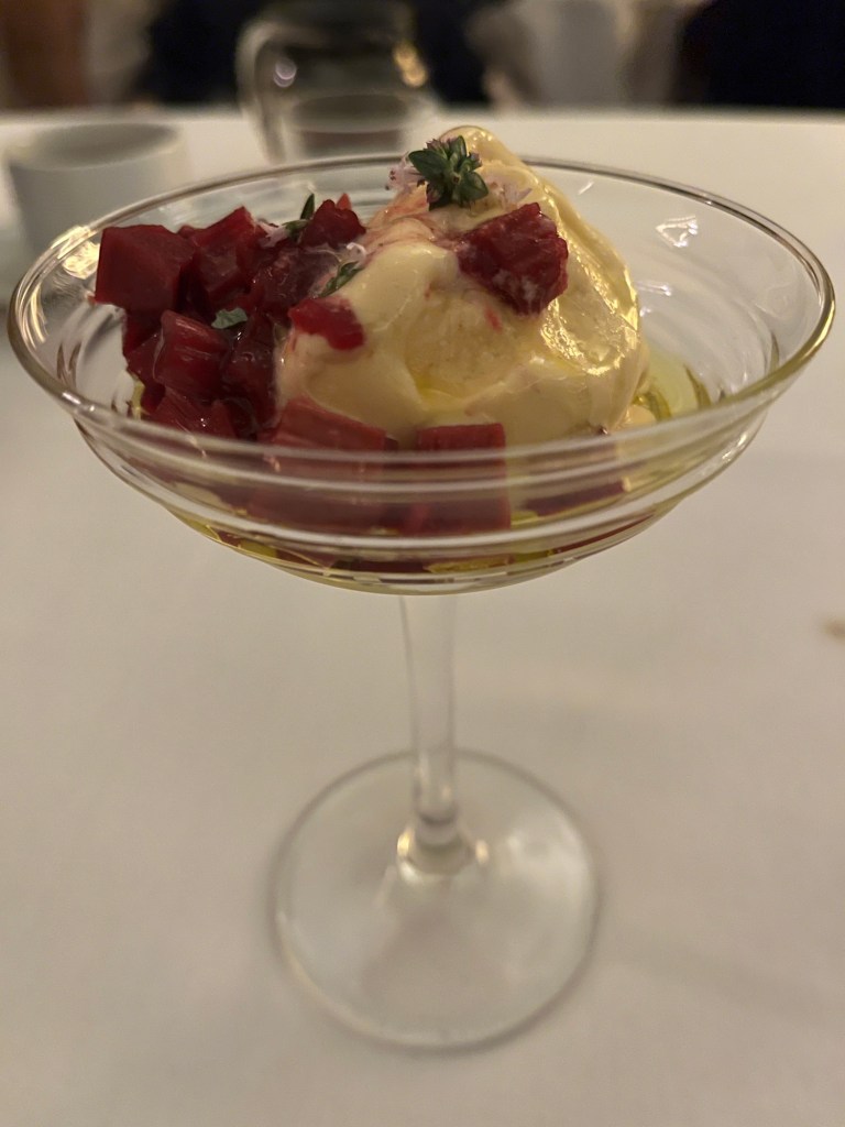 The wines by the glass are enticing, and there’s good assistance available to choose one when not already choosing the optional wine matching. I’m offered an off-menu Savagnin by Defialy and it is delicious, with great mouthfeel and complexity, showing good fruit, but layered with honeyed notes. Catherine decides on the Garganega by Alla Caster, which is one of a few Italian wines by the glass offered, on a local leaning list. They both go nicely with our mackerel dish, which is a pleasant surprise for Catherine not normally loving mackerel. It is served in a ceviche type style, diced and mixed with asparagus through a buttermilk sauce, with chips used to add some texture.