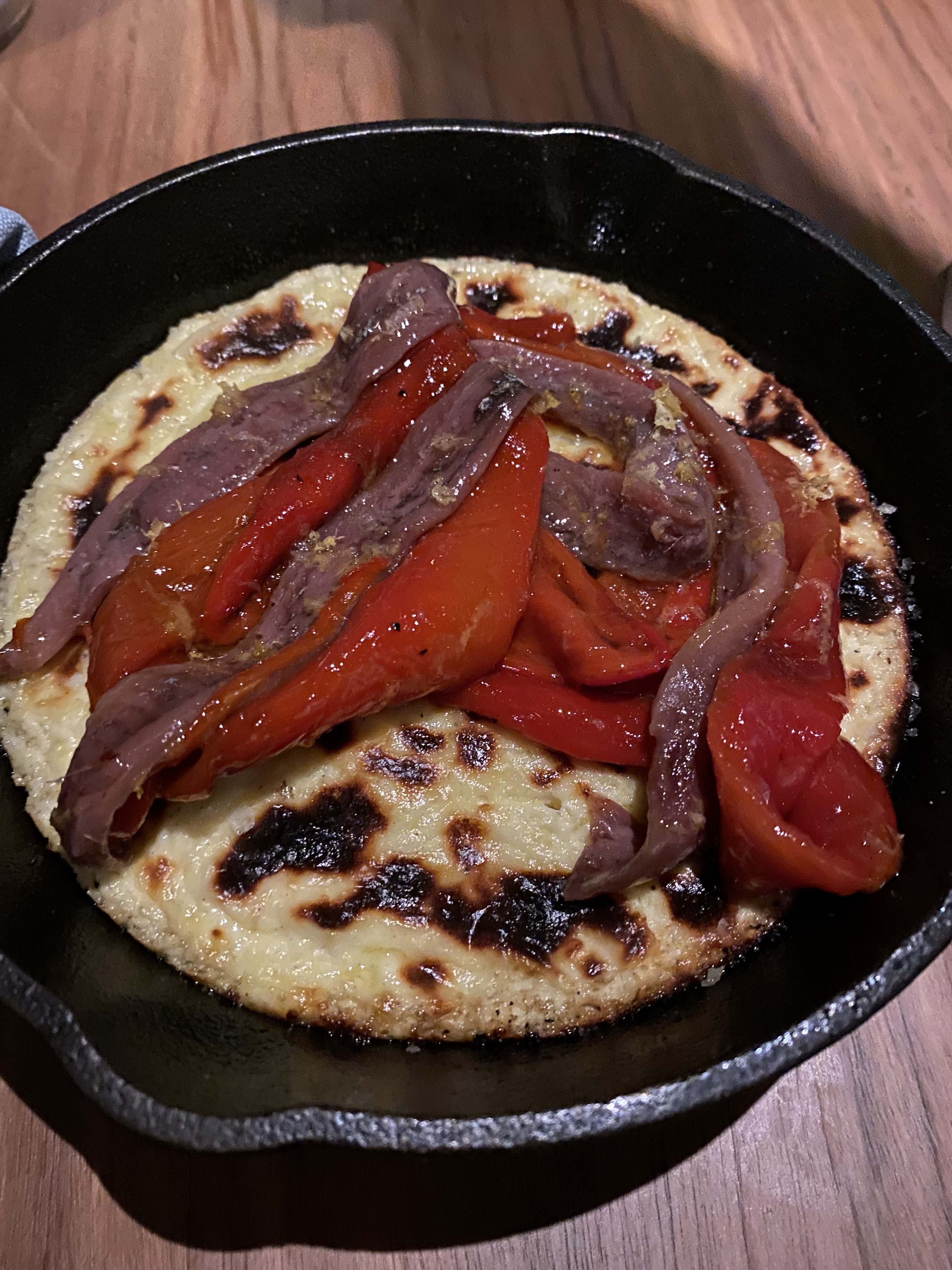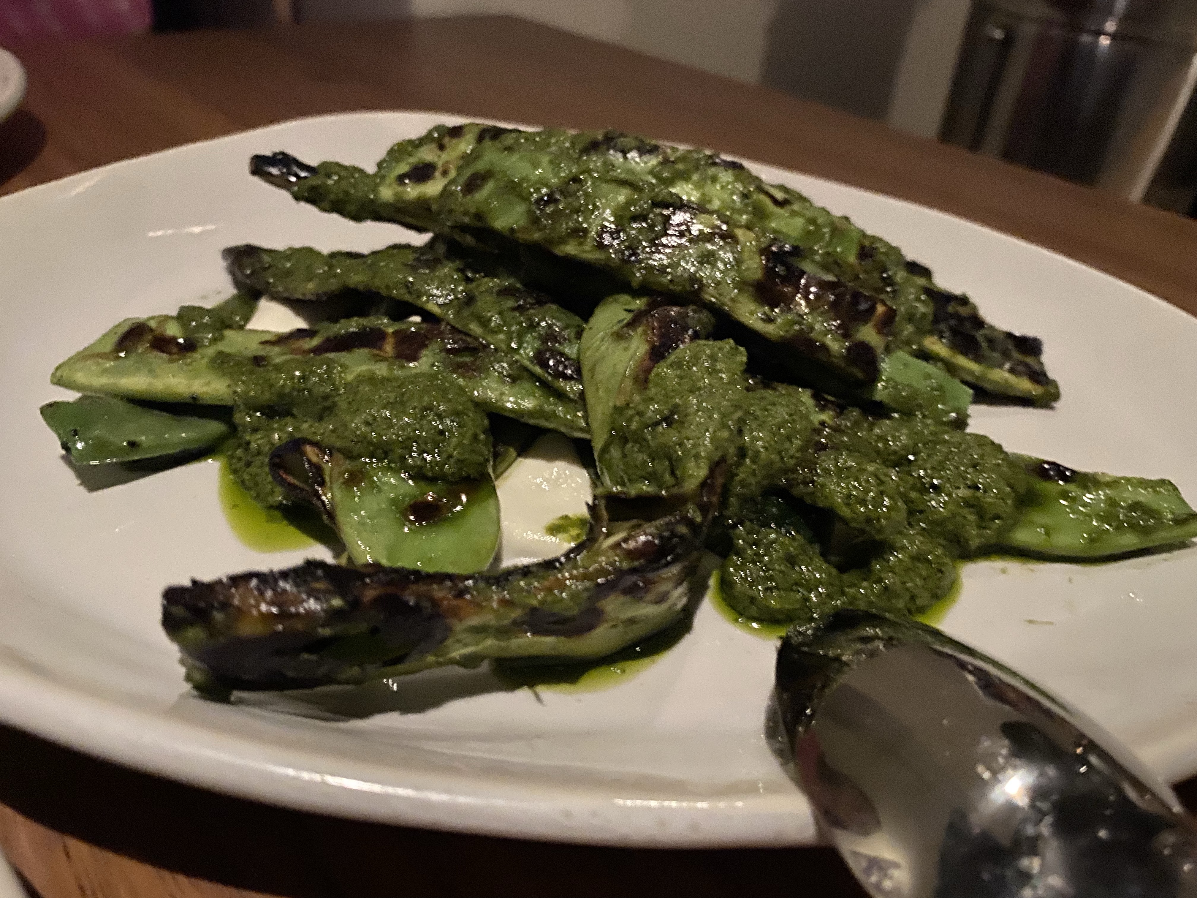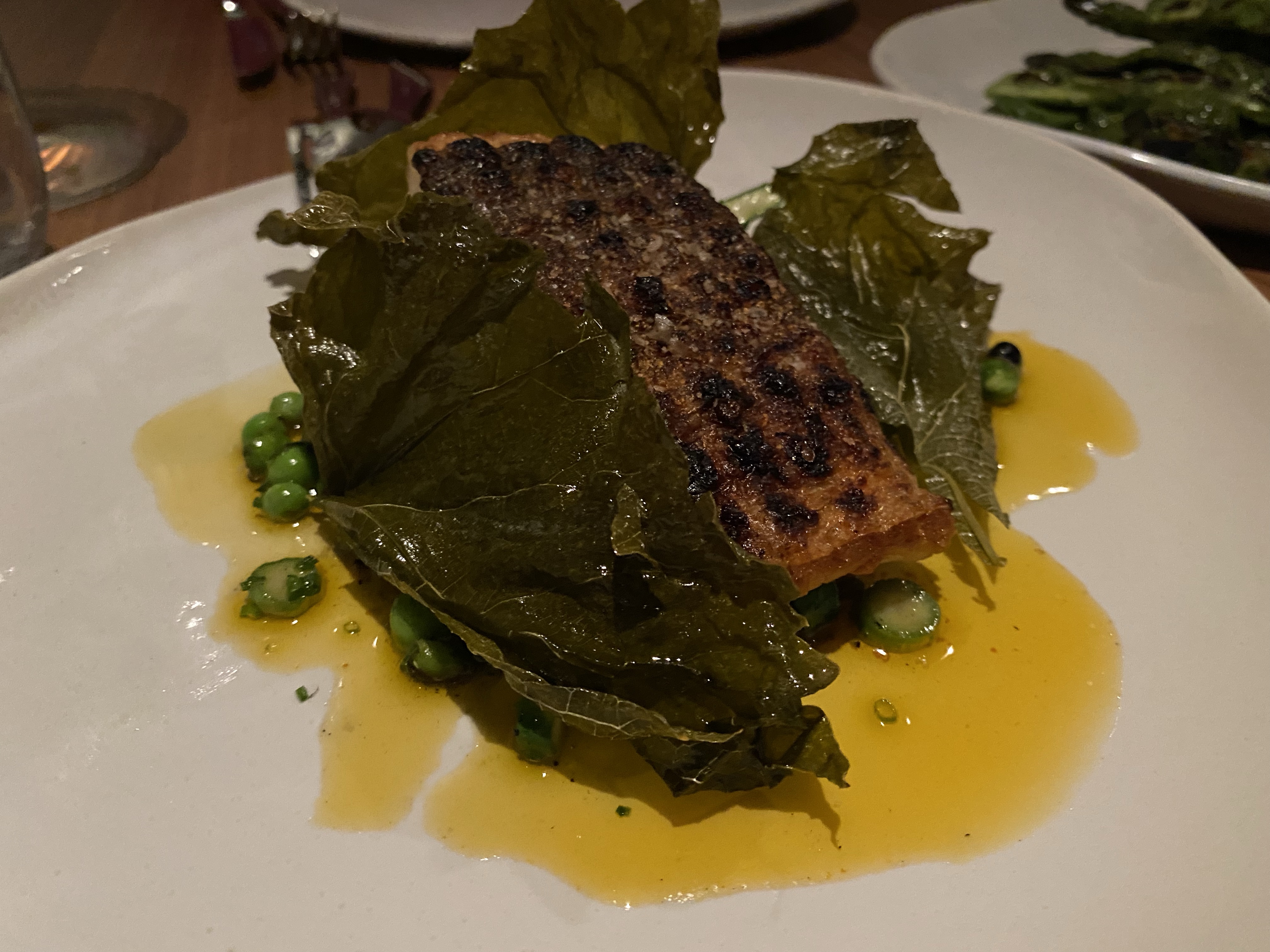 Next, the scorched salmon is meltingly good, and we are getting on a roll. By this stage we are on to our next wine. We have a terrific sommelier who has already poured us a Reserve Gosset Champagne which is a rare offering, and a first for us at a restaurant. It sets us on a path with this very expensive wines by the glass list. The Chardonnay by Salem & Co (Oregon) is exceptional with elegance and complexity from low/no irrigation. The Fiano from Campania is also a beautiful expression, despite the price tag.