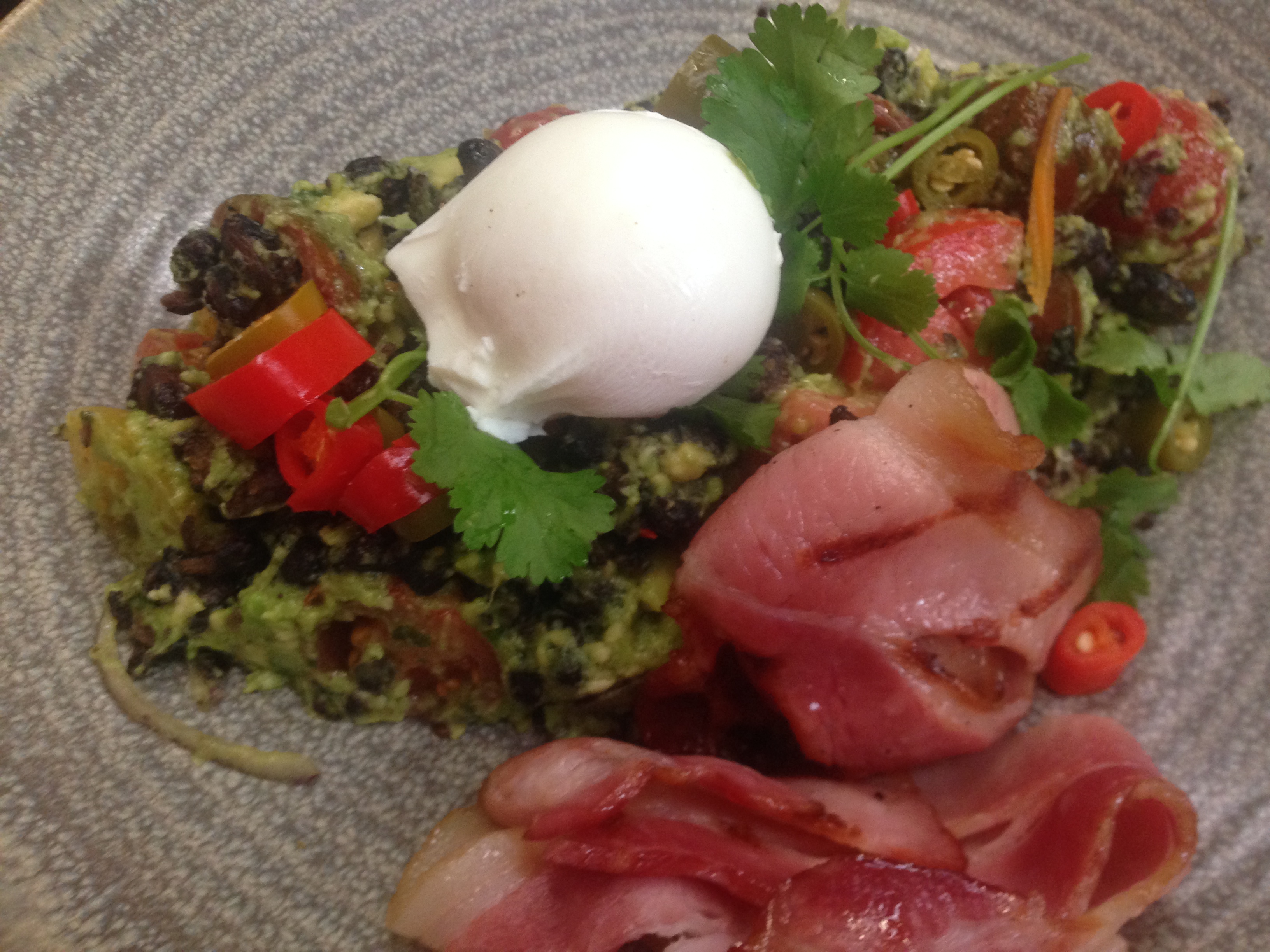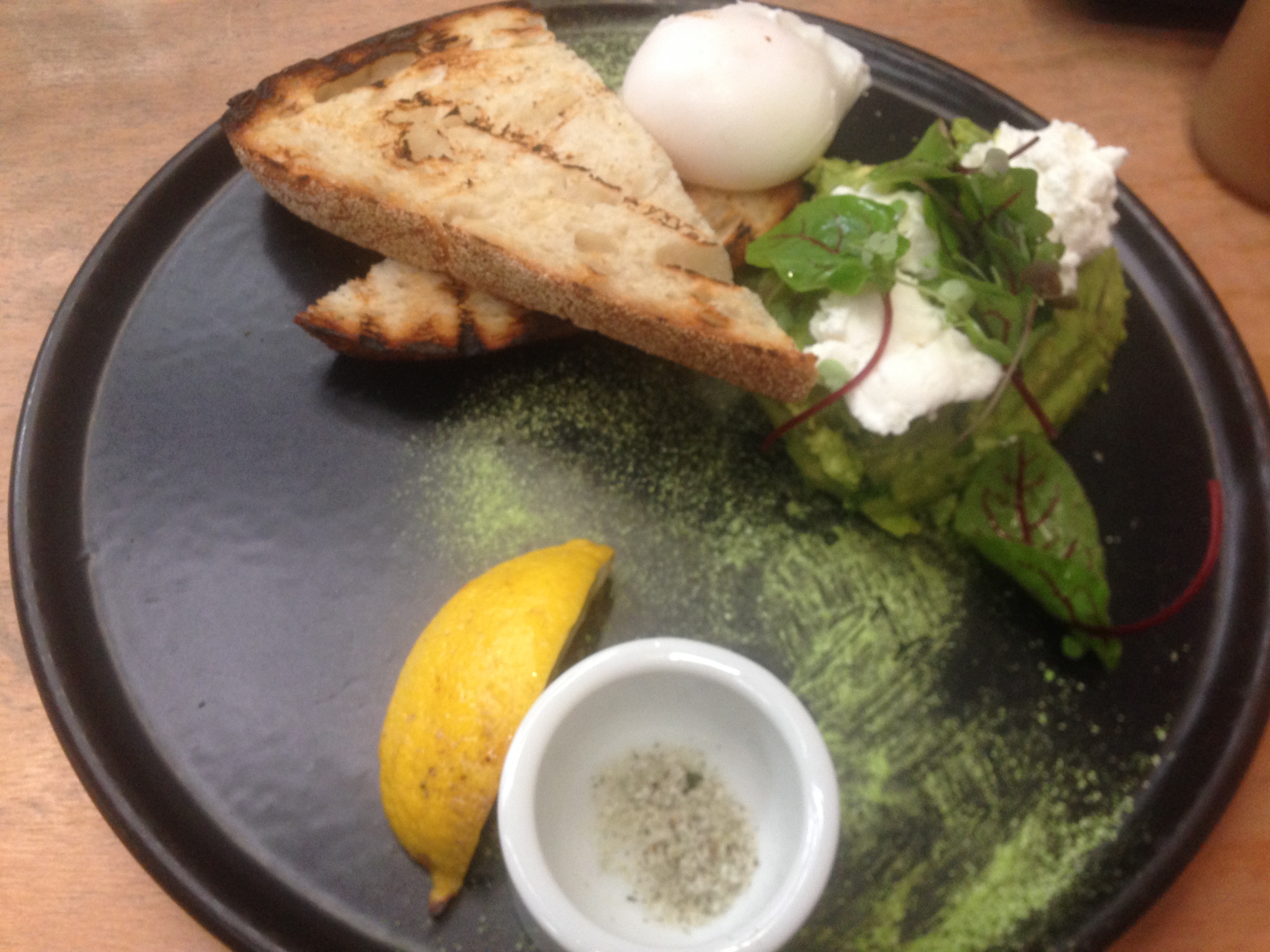 The Hulk – smashed avocado with peas, fresh mint, pickled onion, papitas, sesame, whipped feta and toast, and a poached egg (on the side)