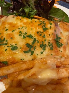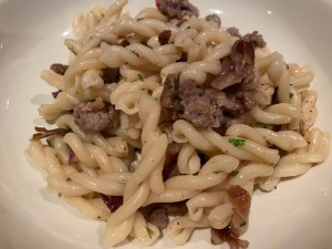 I’m now on to the Dolcetto d’Alba (E. Pira by Chaira Boschis) and while the waitperson was right that it is a touch tannic for the suckling lamb, I’m glad I tried it. The lamb is another excellent dish, but I cannot help but think the serving size is to accommodate far bigger eaters than Catherine and I. You don’t get tasty lamb with chickpeas and chorizo often, so we managed to finish every last mouthful in any case. The side salad is also completely finished, suggesting it is far better than average, with the orange really lifting it.