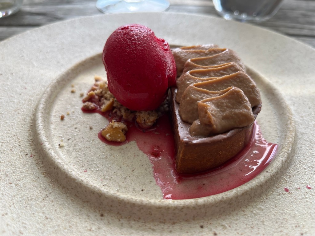 What also shut was most signs of any further service, with the terrace often bereft. We asked for our sparkling and tap water to be refilled and were given a jug of outside temperature water with no ice, and forgotten about for most of our time outside until later when my sparkling was again refilled. Our superb, but melting dessert, of chocolate tart with raspberry sorbet, was delivered long after any opportunity of a two hour dining window, making us start to question whether having a five course meal was even possible.